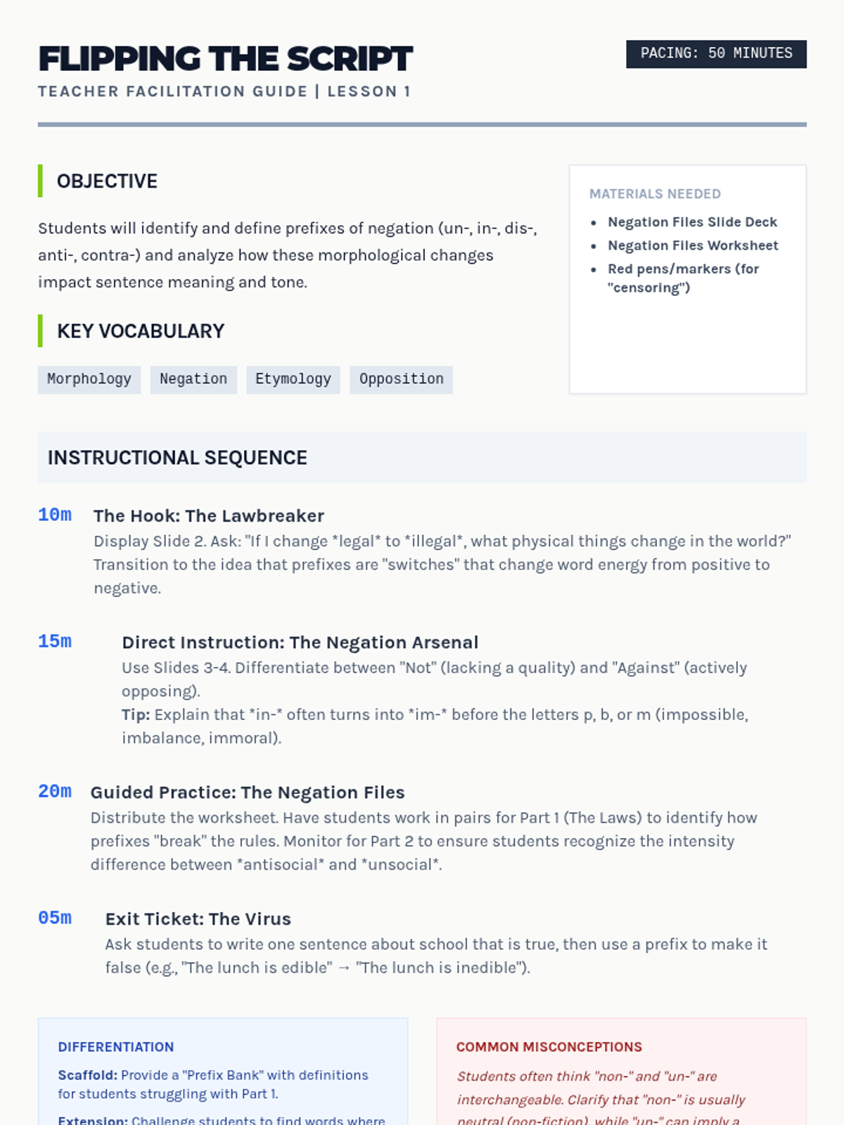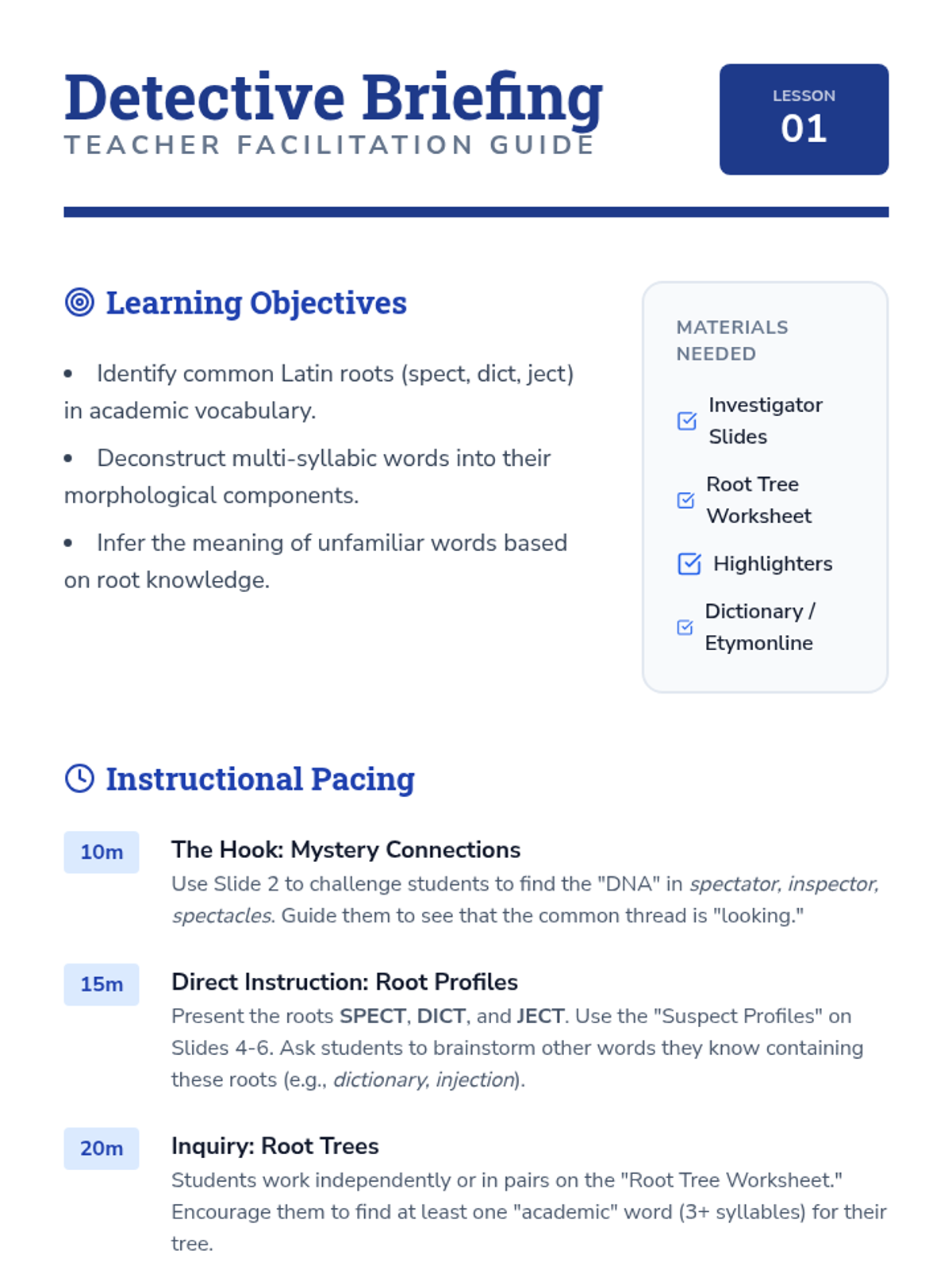 A 6th-grade vocabulary sequence where students act as linguistic detectives, using prefixes and suffixes to decode complex words in science, math, and social studies contexts. The unit emphasizes inquiry-based learning and morphological analysis as a tool for independent reading.