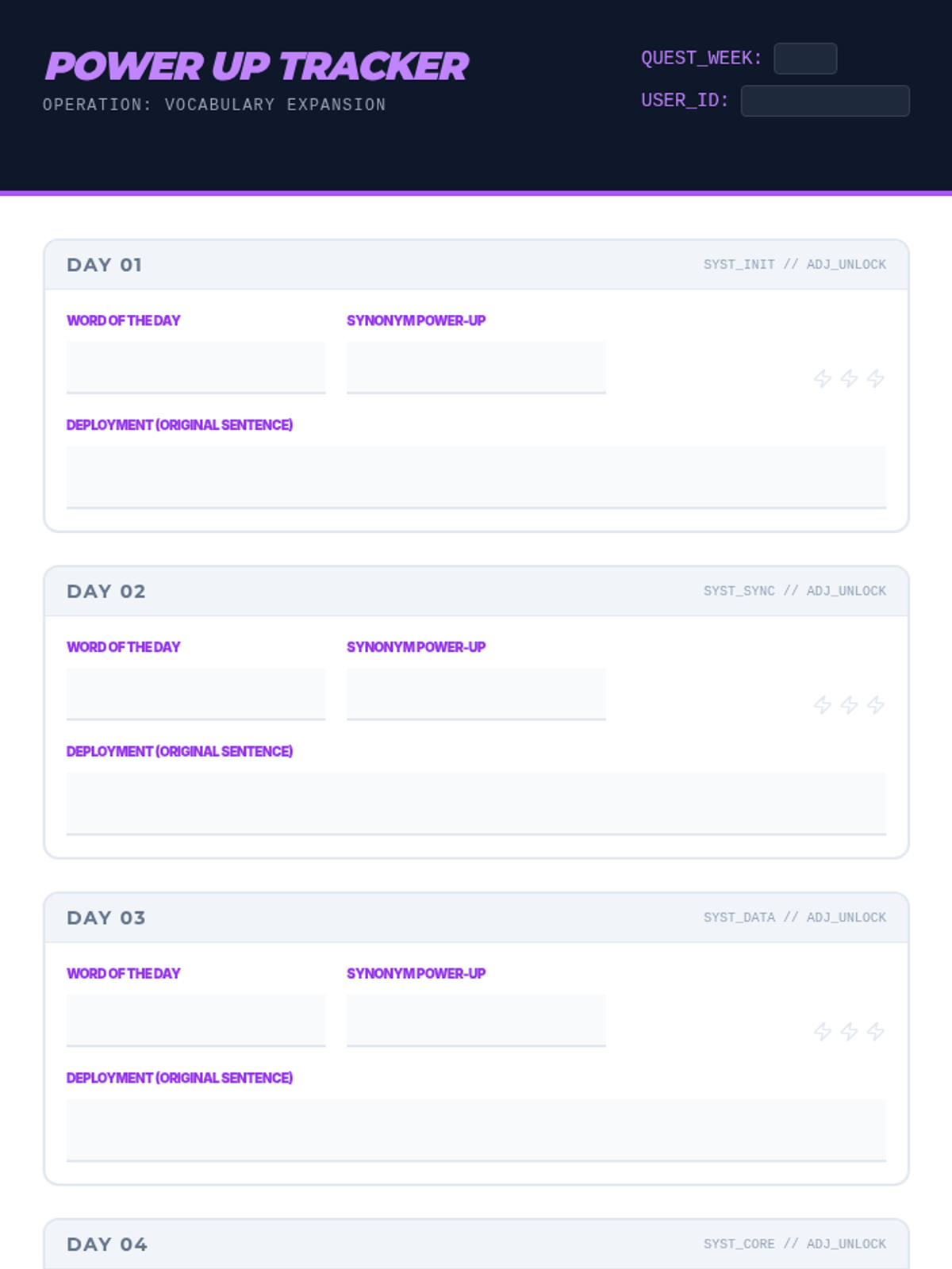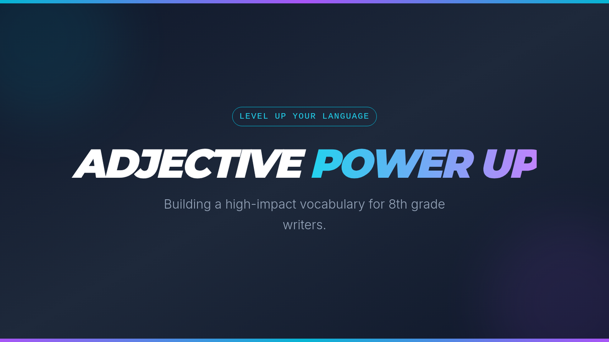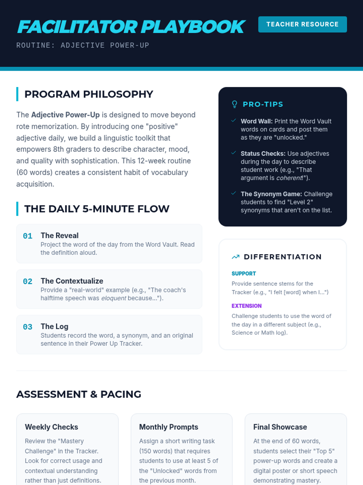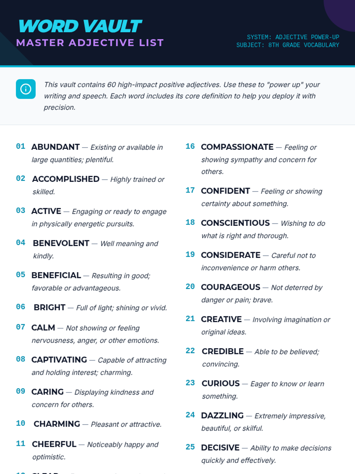 A comprehensive vocabulary routine designed for 8th-grade students to master 60 high-impact positive adjectives. This sequence provides a daily framework for linguistic 'power-ups' to enhance descriptive writing and verbal expression.