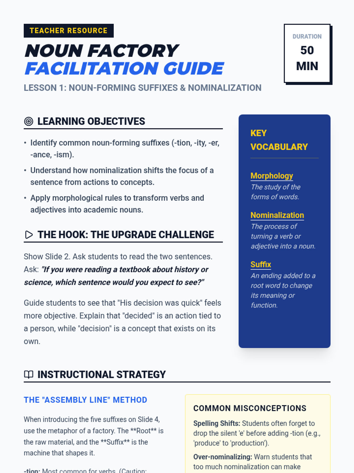 A comprehensive 8th-grade sequence exploring how suffixes transform words across parts of speech, focusing on nominalization, adjectival shifts, and connotative nuances. Students learn to manipulate word forms to improve sentence variety and precision in their writing.