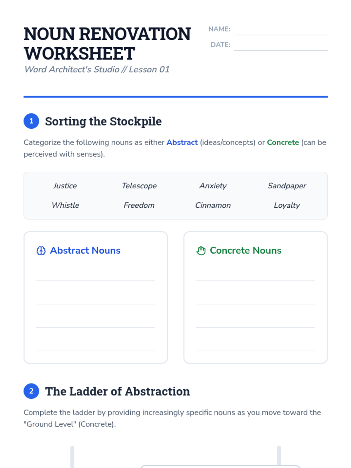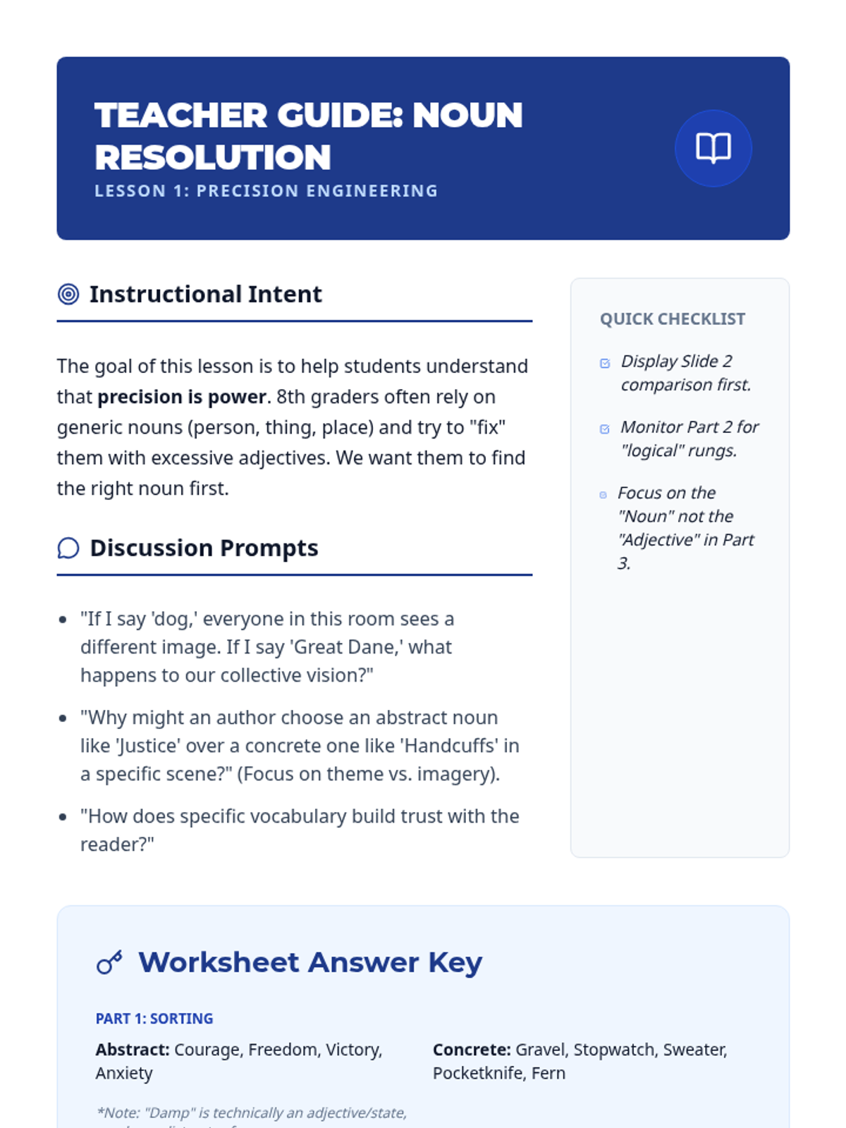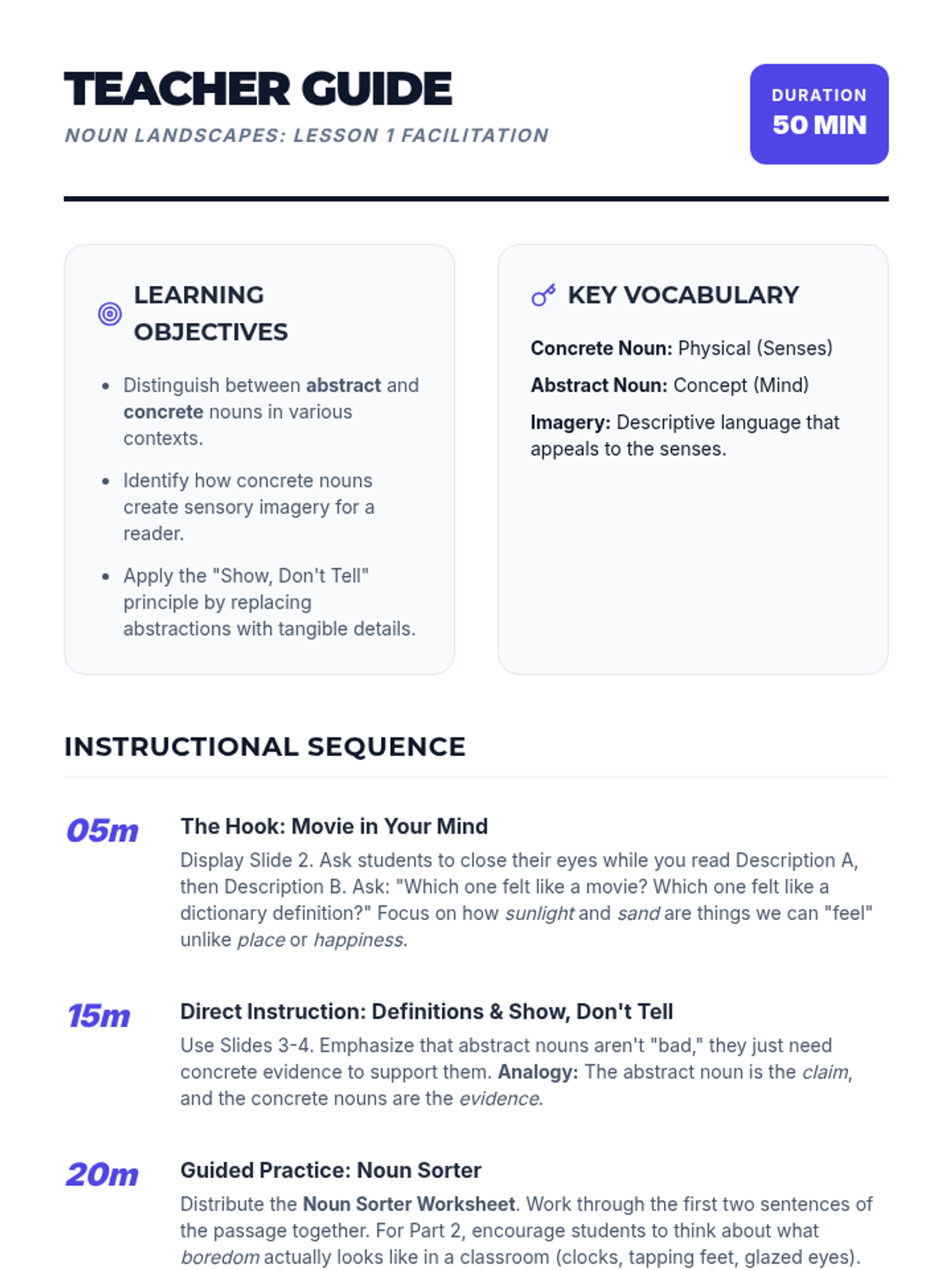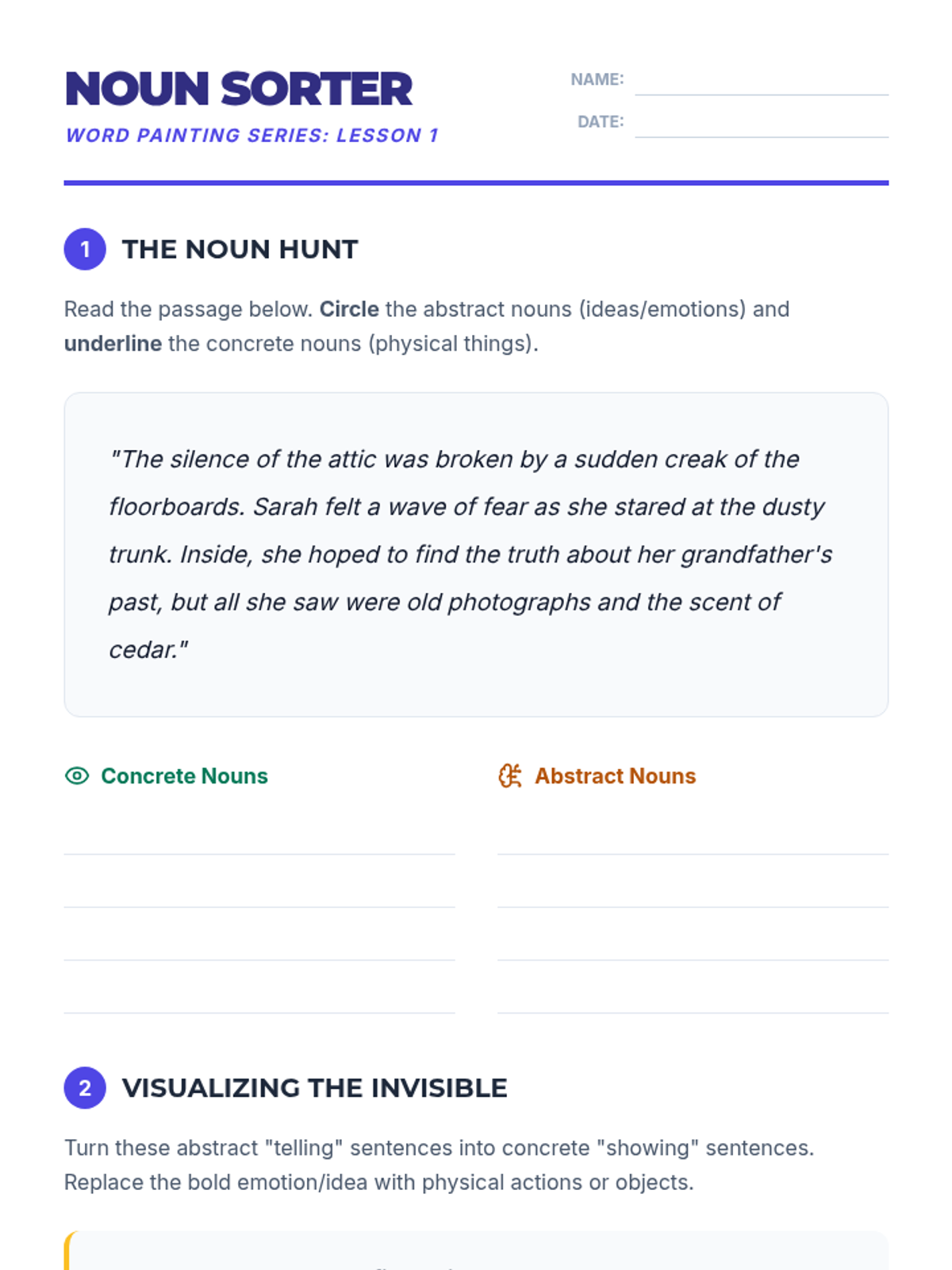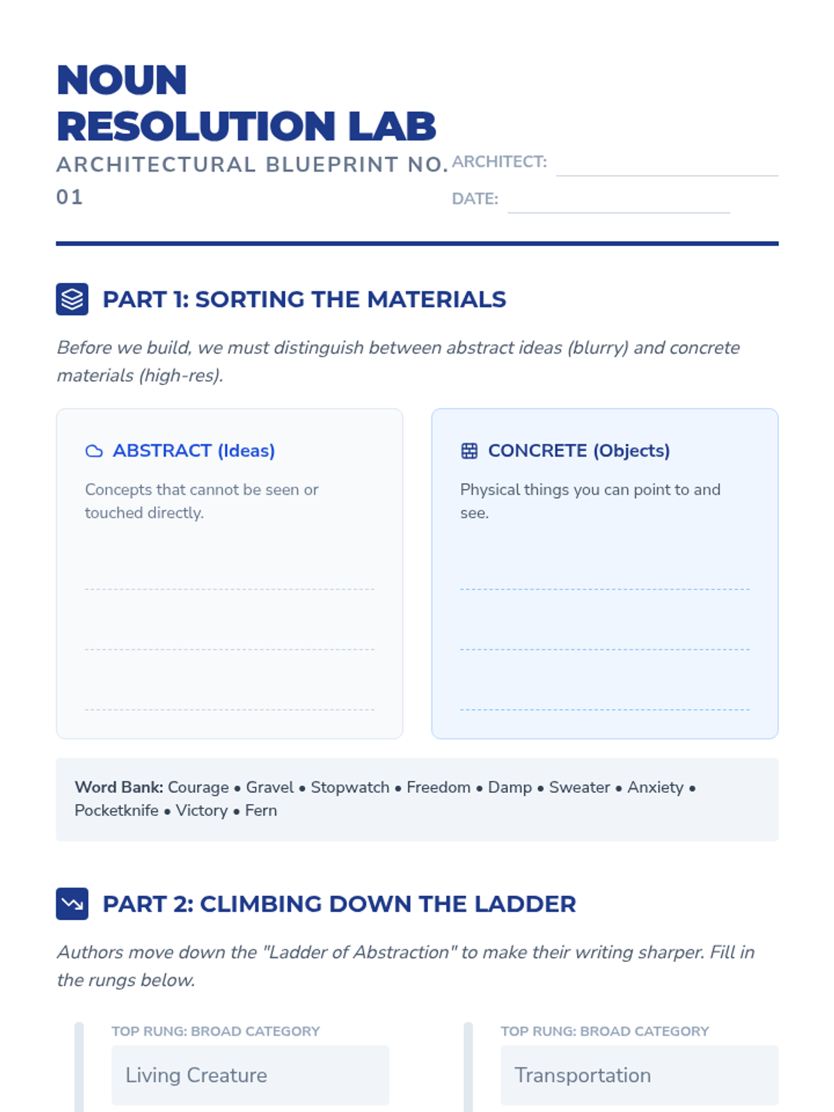 This writing workshop sequence moves students beyond basic identification of nouns and adjectives toward strategic application in narrative writing. Students practice replacing general nouns with concrete alternatives and weak adjectives with vivid modifiers to enhance reader visualization.