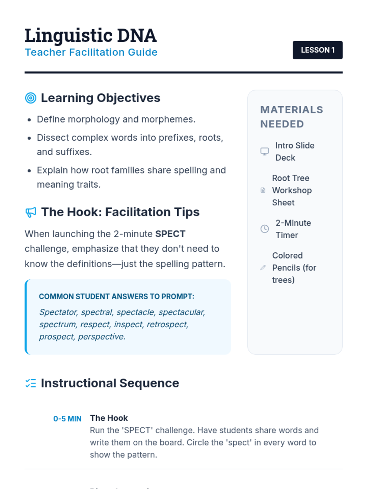 A comprehensive sequence for 6th-grade students exploring word morphology through an architectural lens. Students learn to dismantle and assemble words using prefixes, roots, and suffixes to unlock meaning and grammatical function.