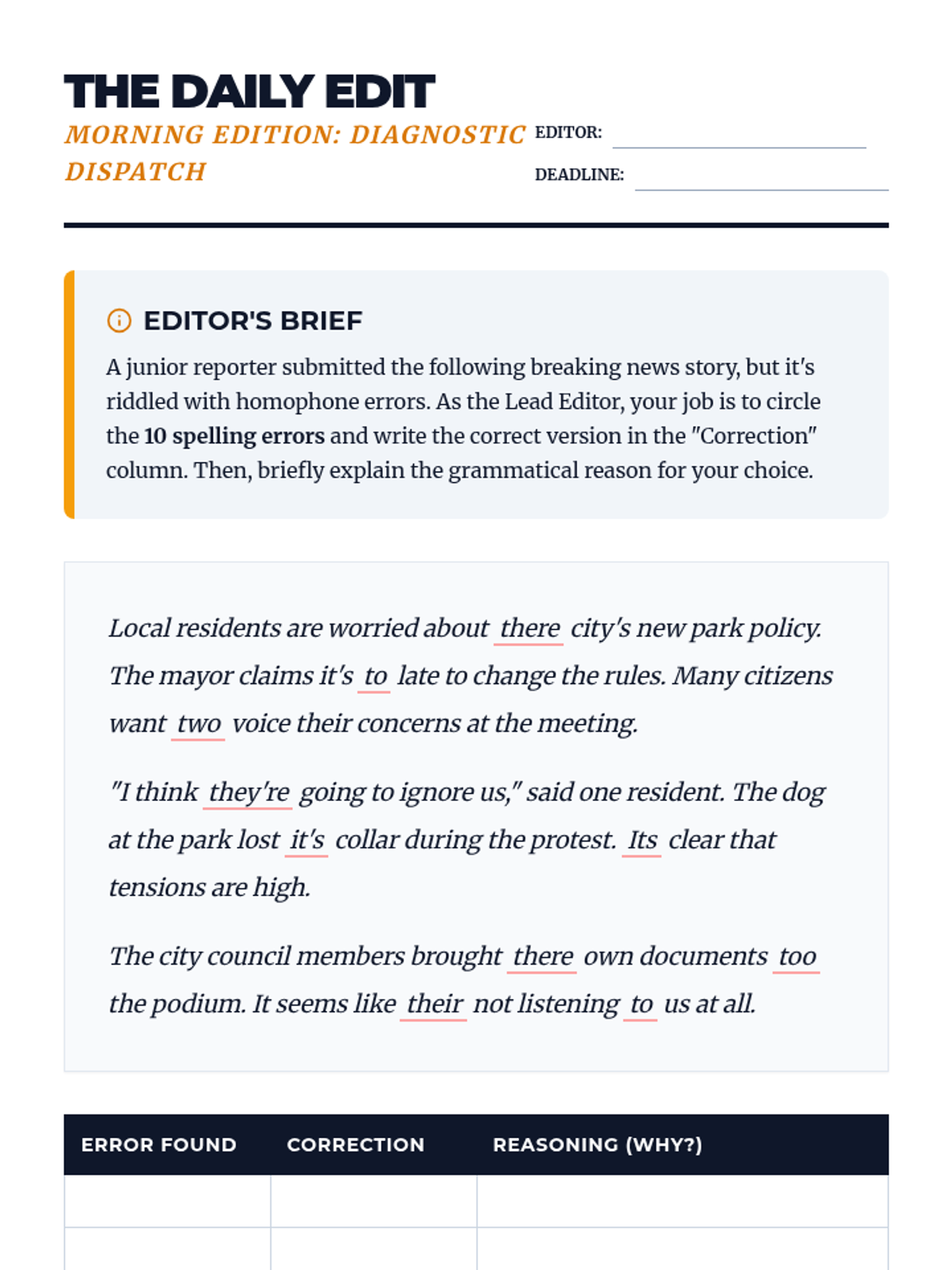 An 8th-grade ELA unit that frames homophone mastery as a professional essential. Students act as a copy editing firm, analyzing the financial and reputational costs of homophone errors through real-world simulations, resume reviews, and newsroom scenarios.