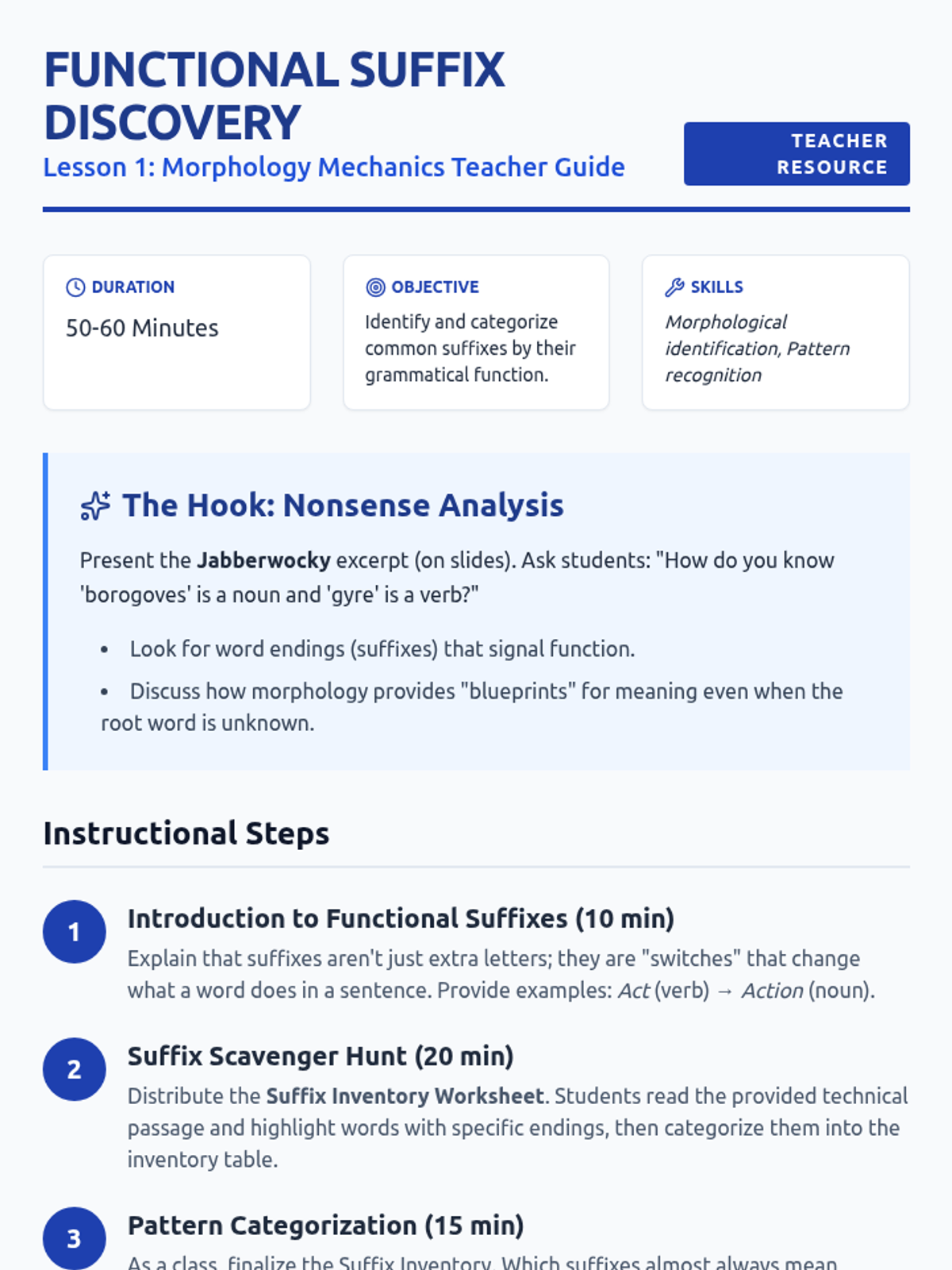 A series of activities focused on morphological awareness, teaching students to 'unpack' words by identifying prefixes, roots, and suffixes to determine meaning.
