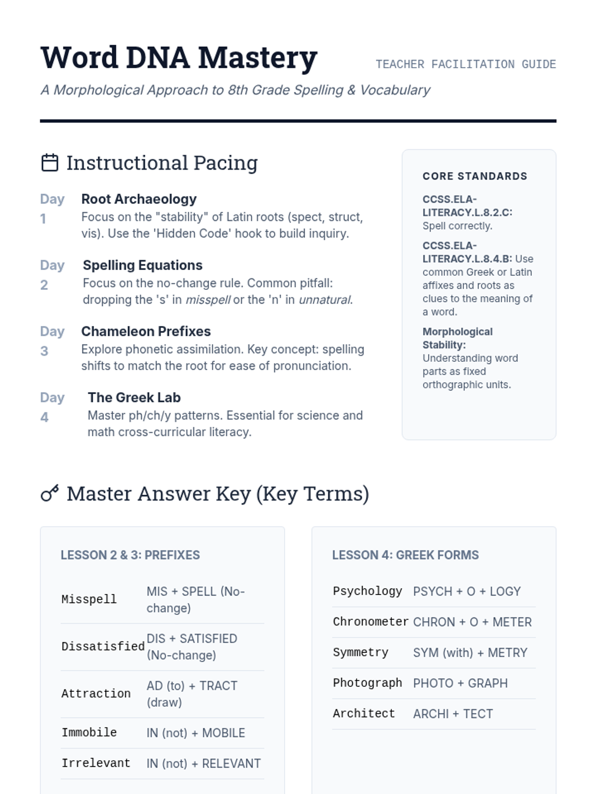 A comprehensive 8th-grade spelling sequence that uses Greek and Latin morphological analysis to master complex academic vocabulary. Students progress from basic root identification to understanding advanced prefix assimilation and Greek orthographic patterns.