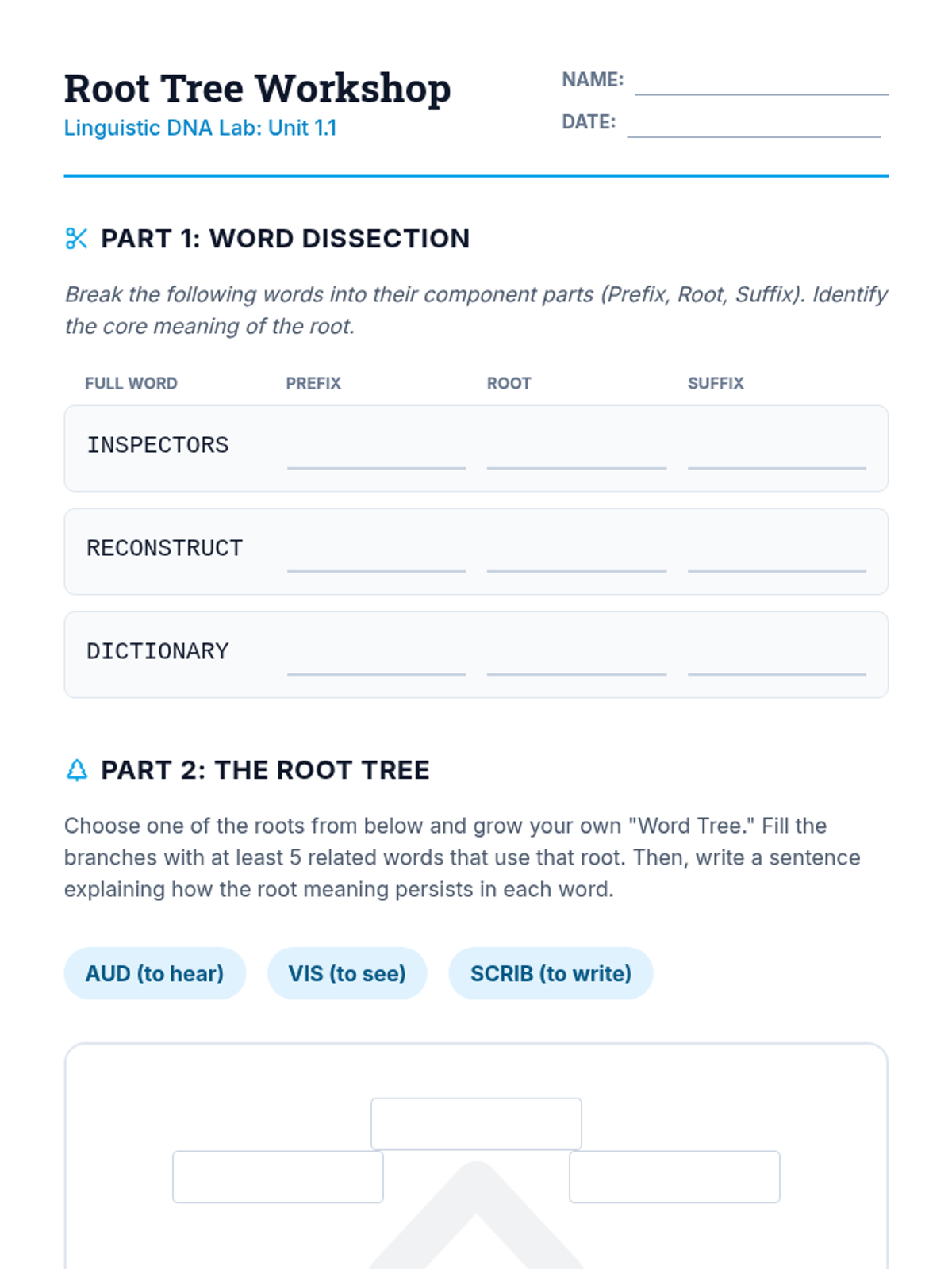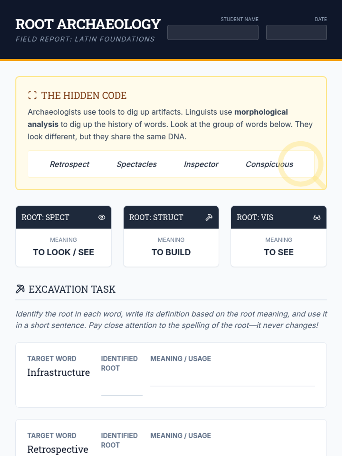 A 7th-grade ELA unit exploring the morphological 'DNA' of the English language. Students analyze Greek and Latin roots to improve spelling accuracy, vocabulary acquisition, and the ability to construct complex words.
