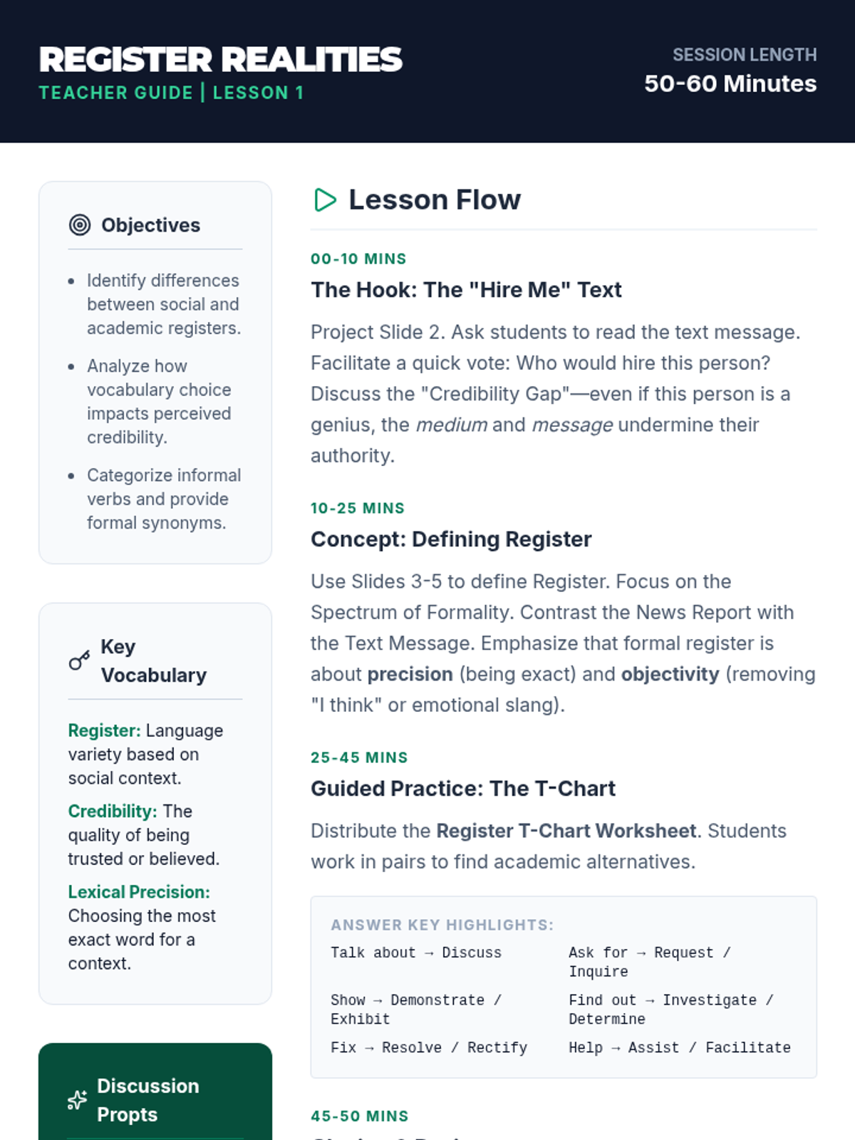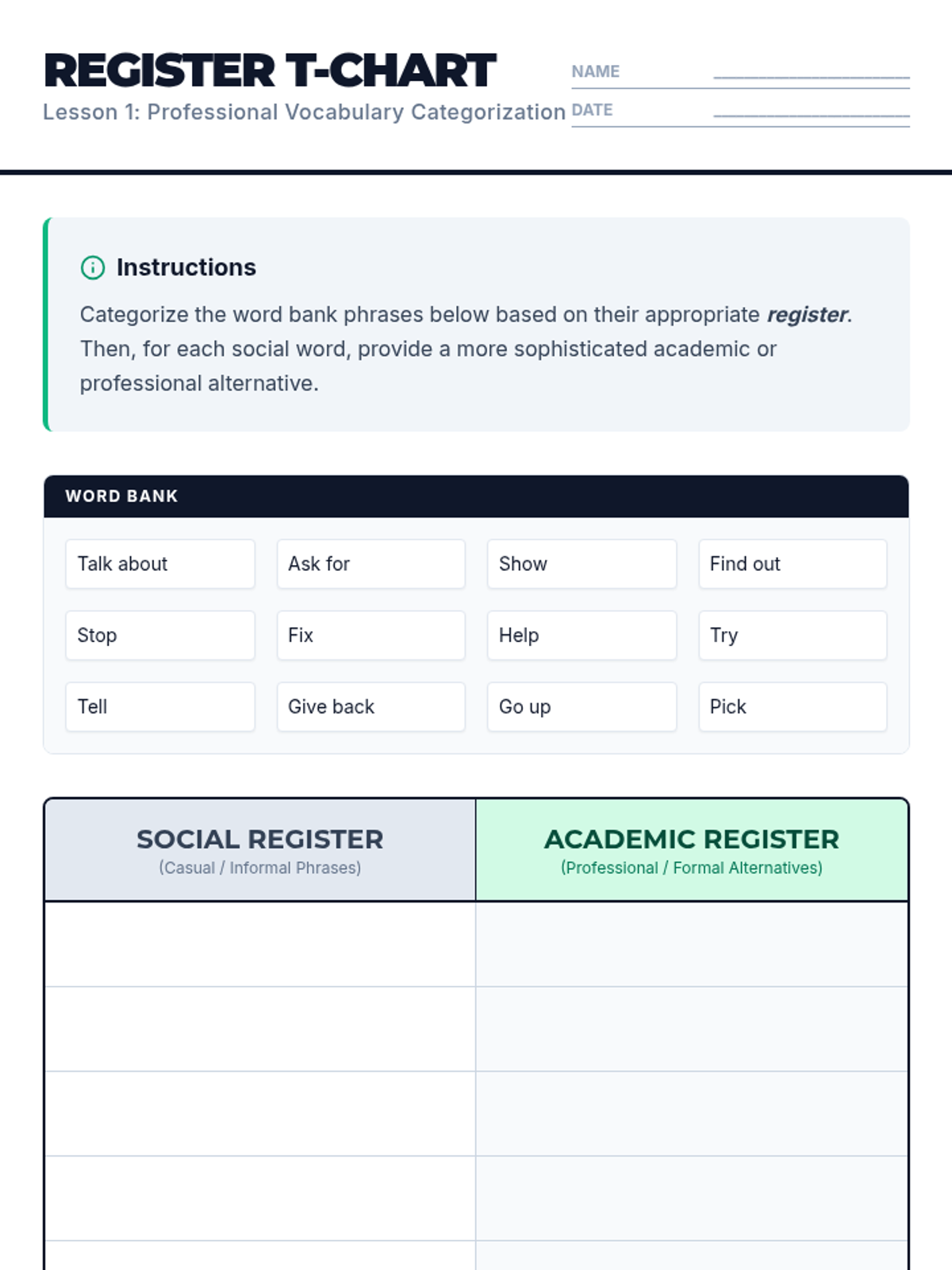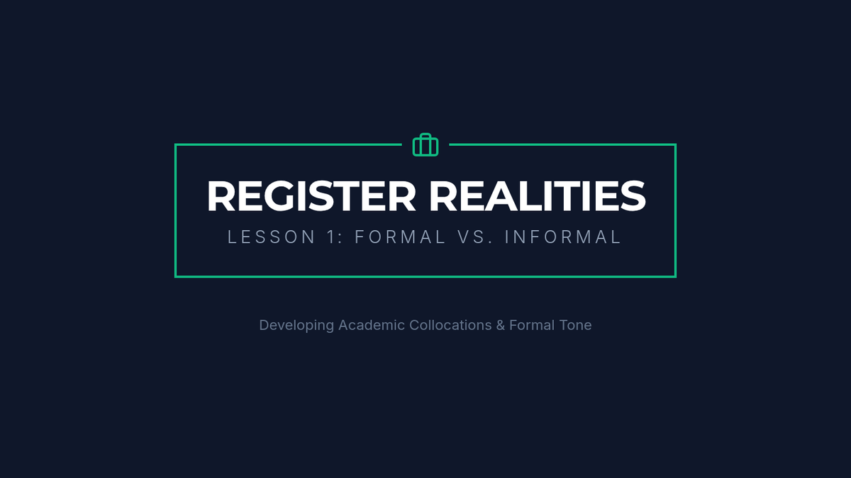 A comprehensive workshop-style sequence for 8th-grade advanced English students focused on mastering academic collocations, formal registers, and professional writing to enhance credibility and fluency.
