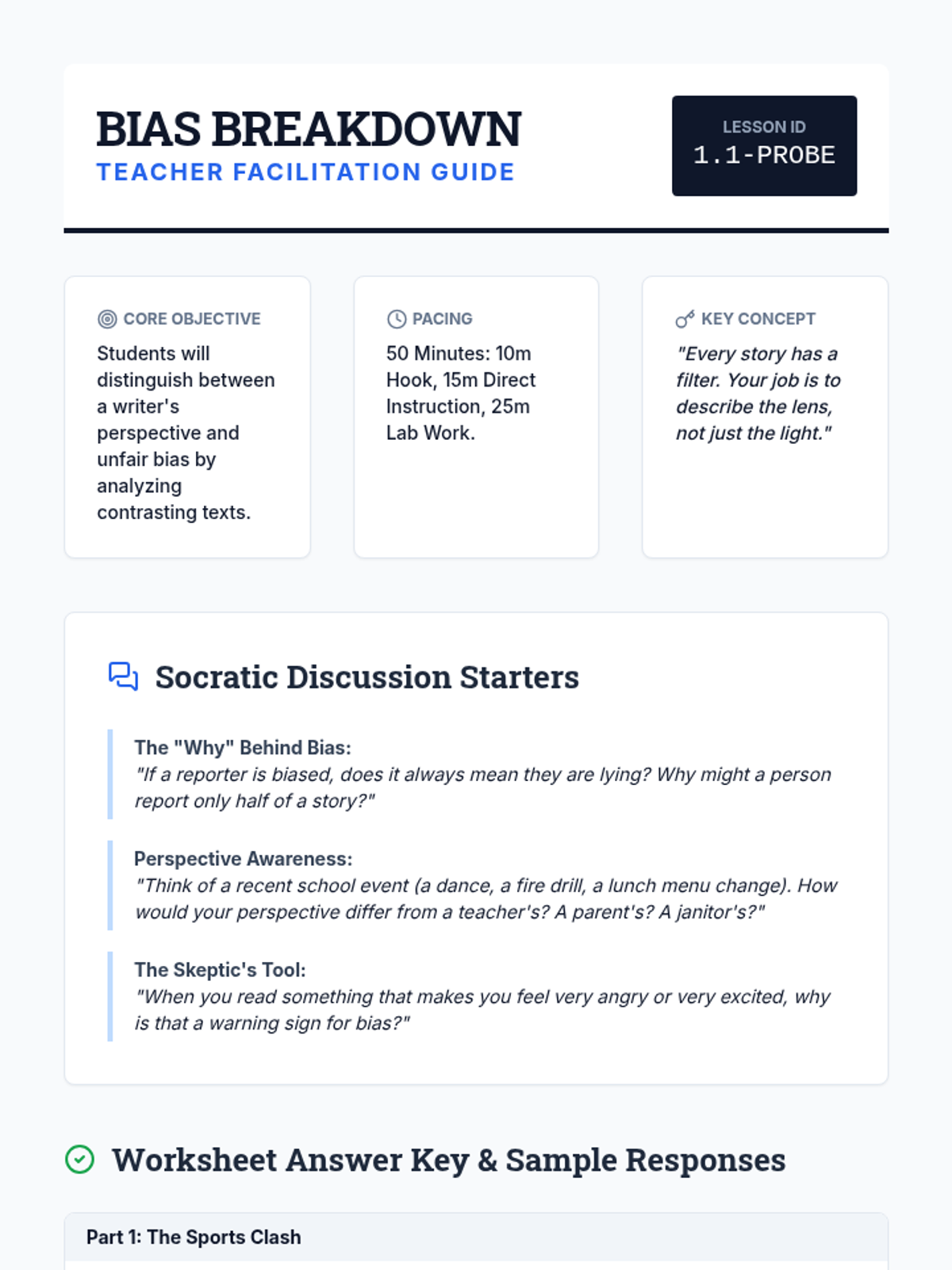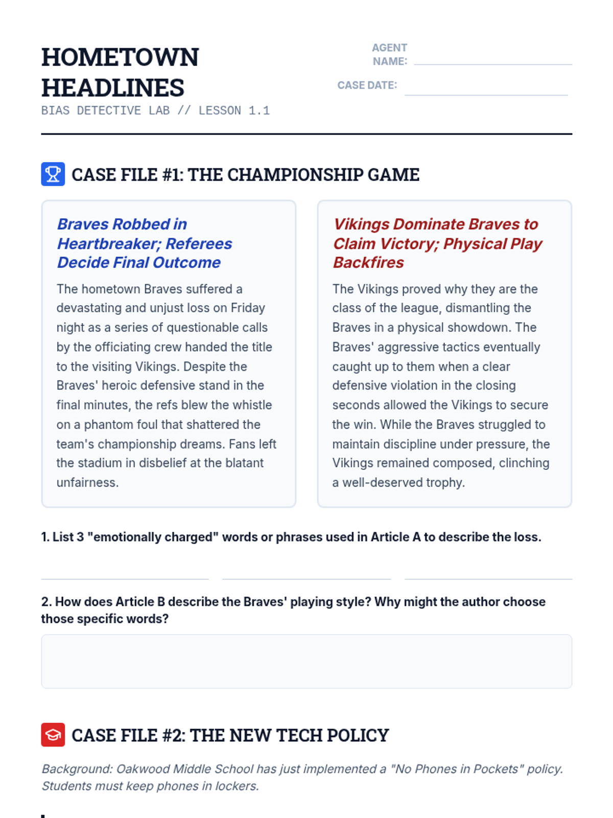 A comprehensive sequence for 8th-grade students to master the art of detecting media bias and evaluating information credibility. Students move from identifying basic bias to deconstructing rhetorical choices, uncovering omitted information, and verifying expert authority.