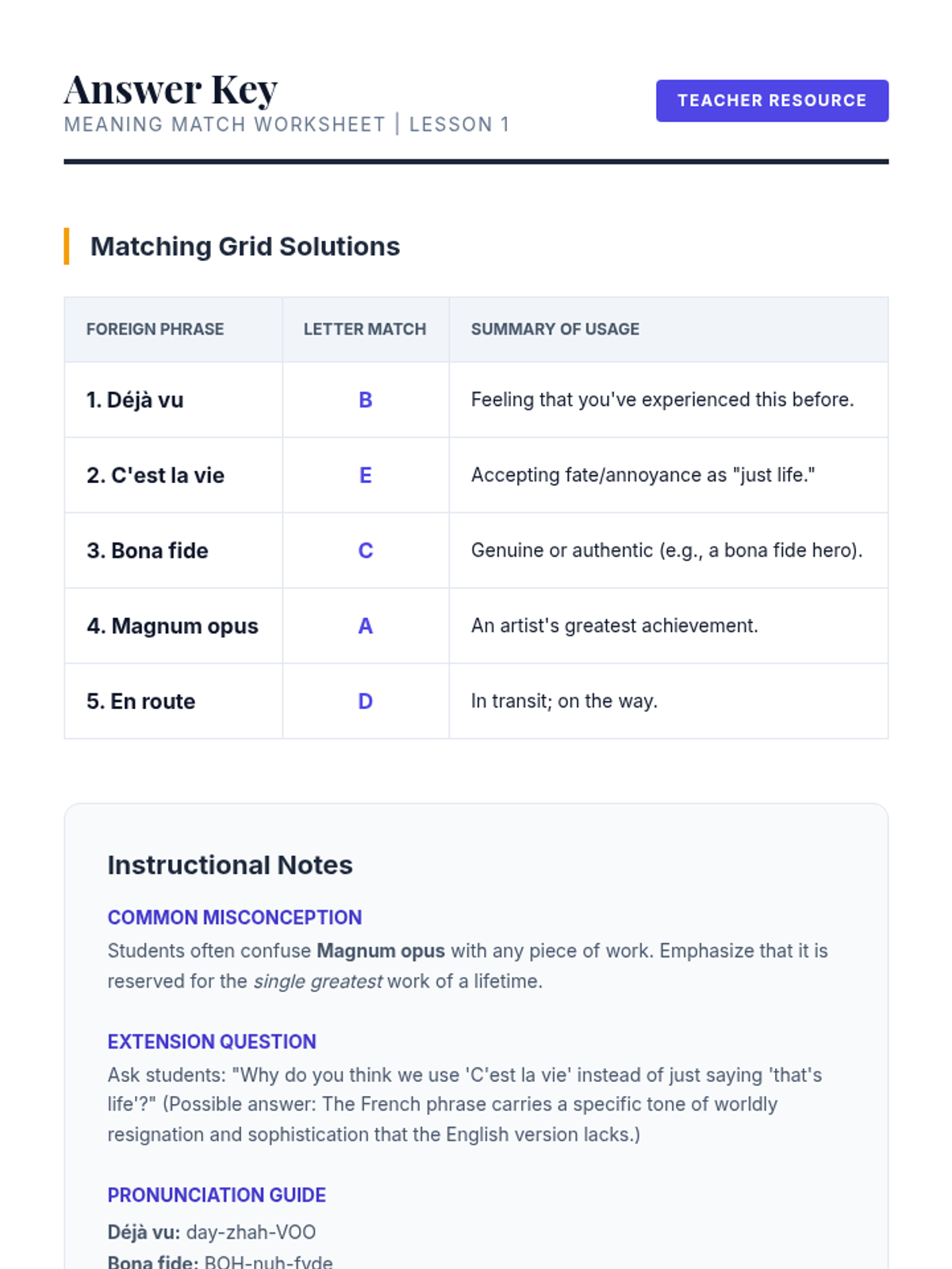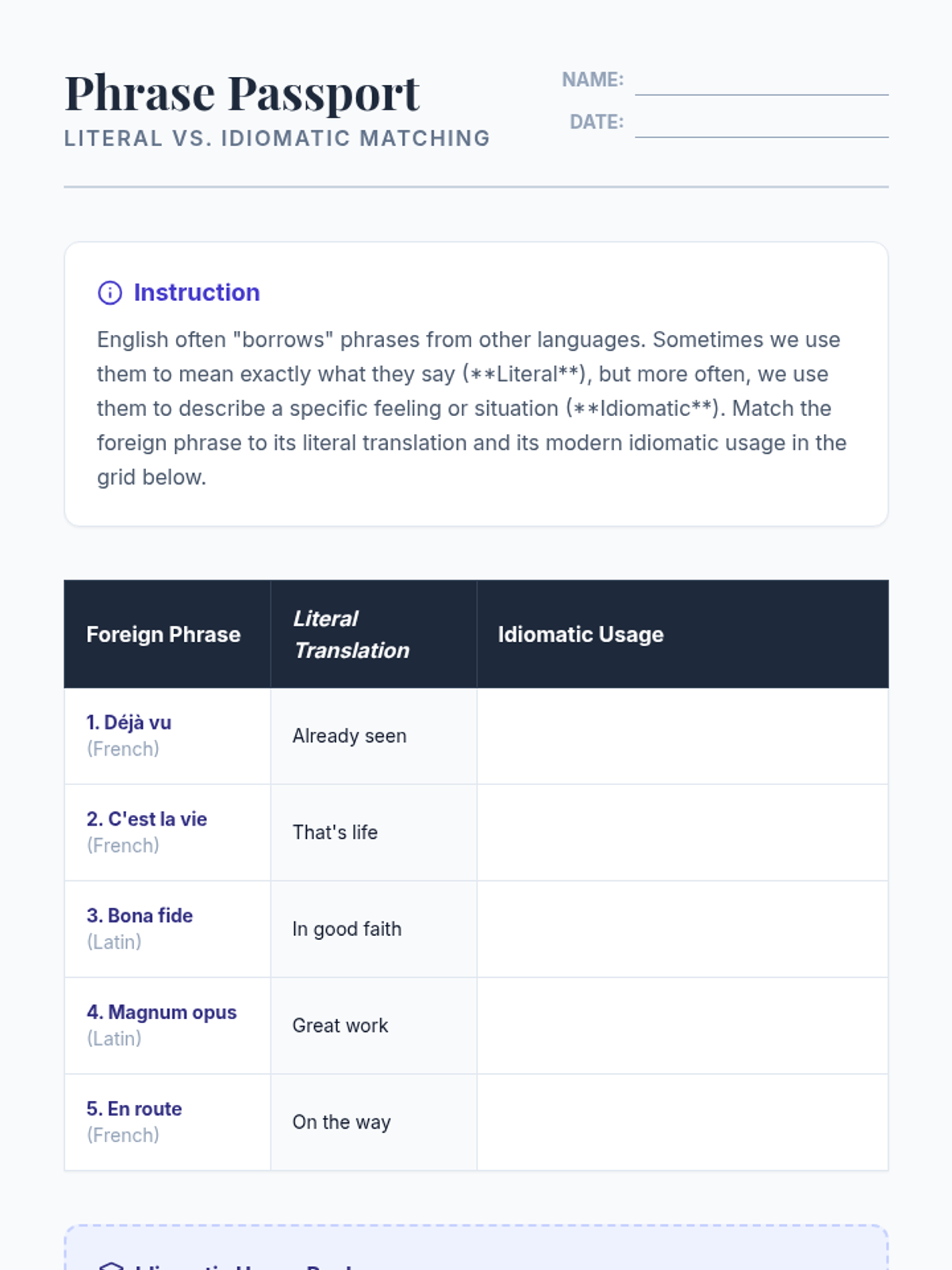 This sequence explores the rhetorical power and nuance of foreign phrases in English, moving from context-clue inference to stylistic application in creative writing. Students will analyze how words like 'carpe diem' and 'déjà vu' add layers of meaning that standard English translations often lack.