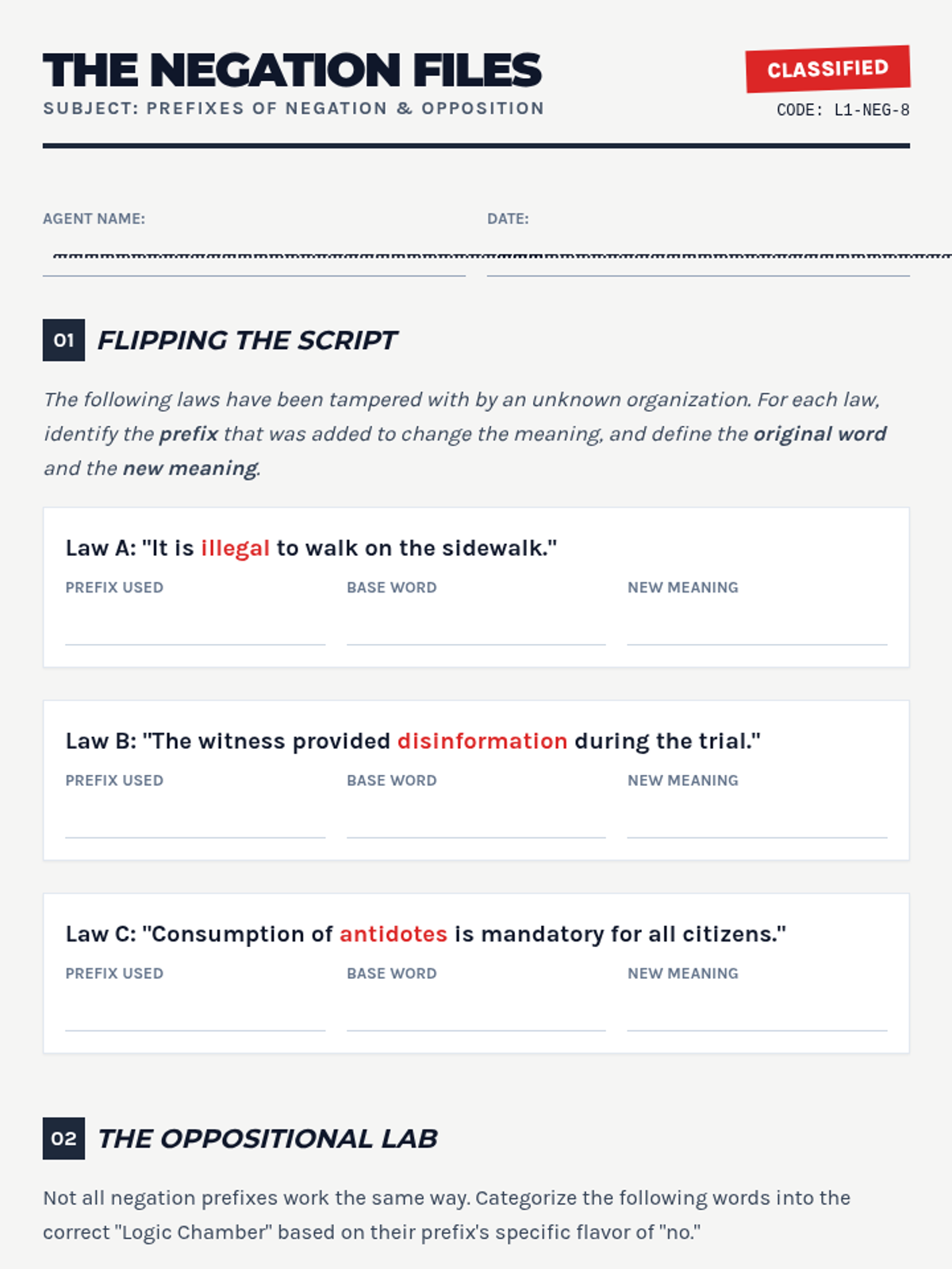 An inquiry-based vocabulary sequence for 8th graders that treats words as codes to be cracked. Students learn to hypothesize the meanings of complex academic vocabulary by isolating Greek and Latin prefixes related to negation, direction, time, and quantity.