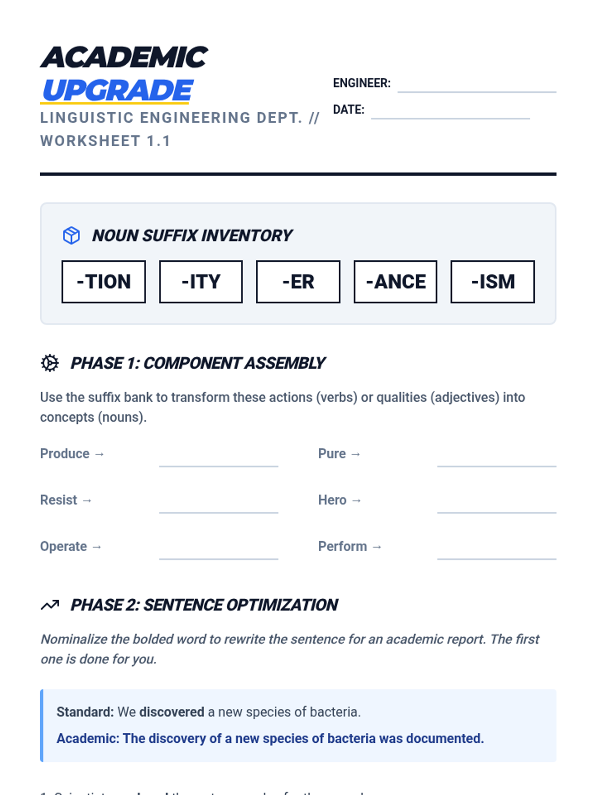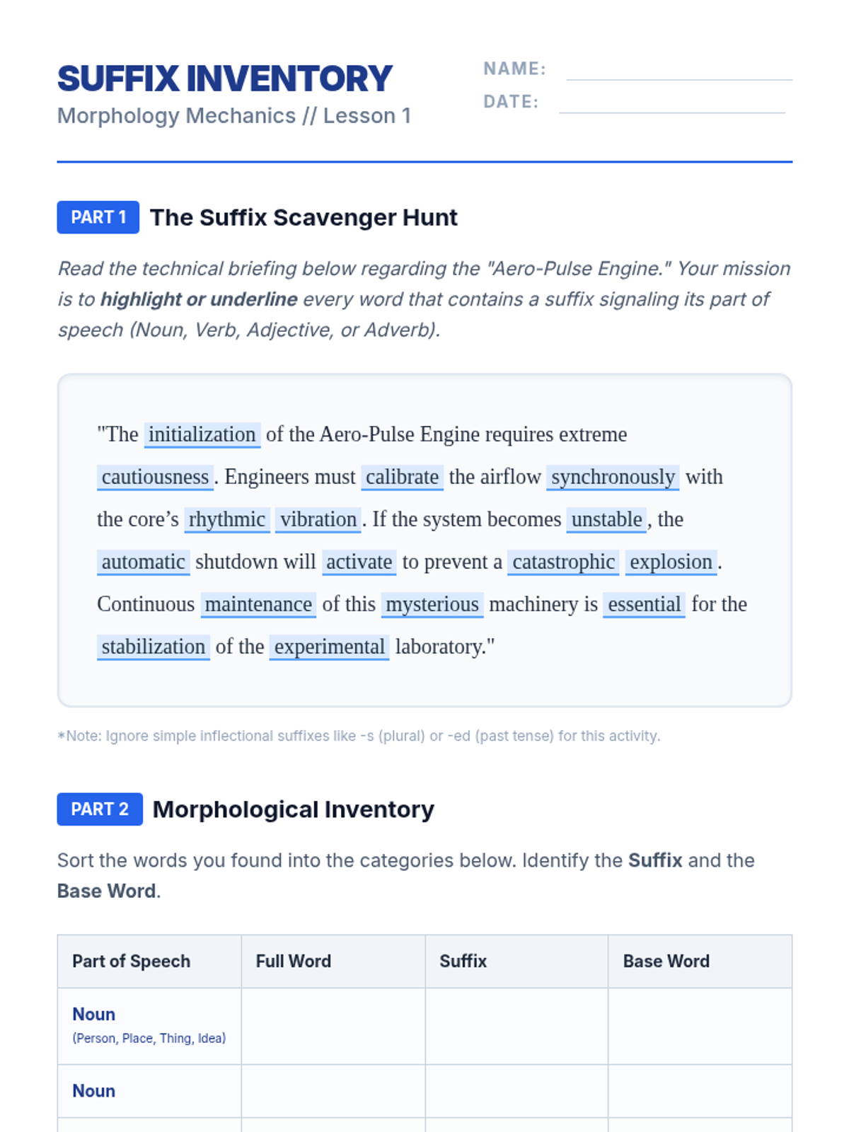A 7th-grade ELA sequence exploring how suffixes transform parts of speech, culminating in a creative project to invent new, grammatically correct words. Students act as 'Linguistic Engineers' to master nominalization, descriptive adjectives, action-oriented verbs, and adverbial modification.