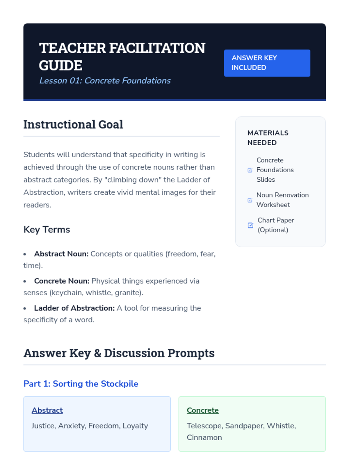 A 5-lesson unit for 8th-grade ELA focusing on the strategic use of concrete nouns and sensory adjectives to enhance narrative writing. Students progress from basic identification to sophisticated revision techniques and drafting vivid vignettes.