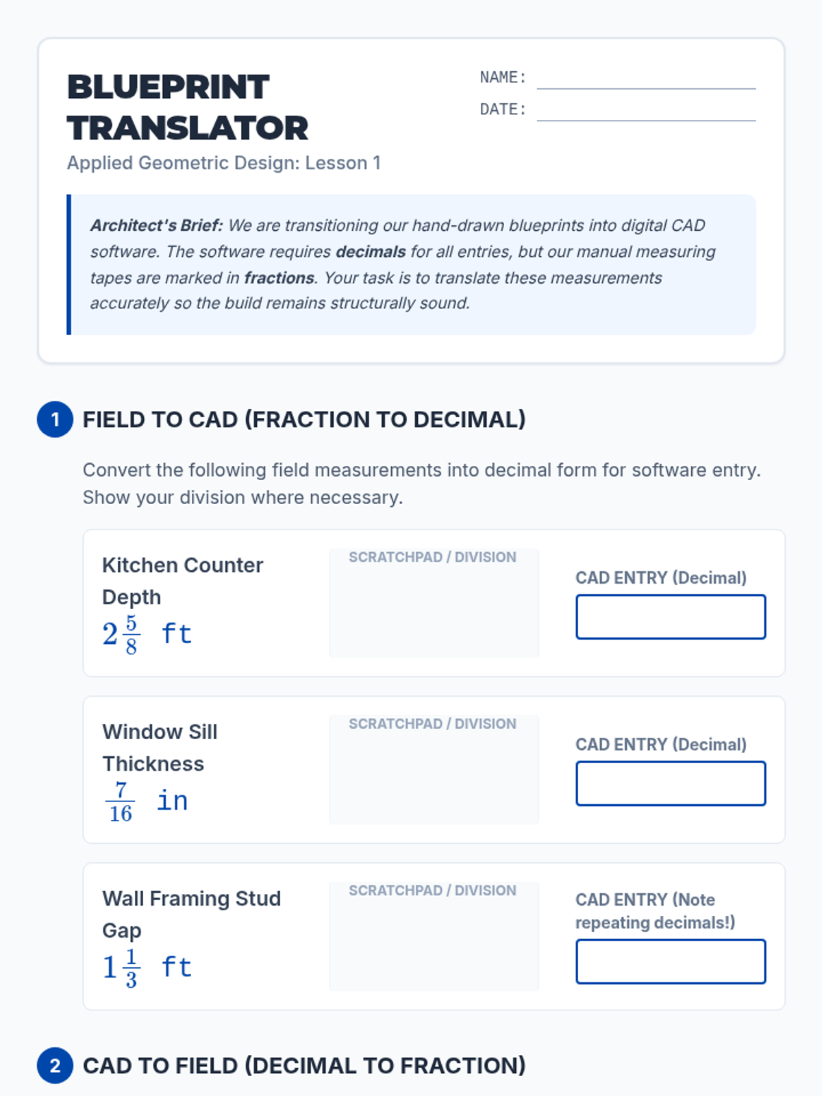 A specialized math support sequence for 8th-grade students, focusing on the conceptual understanding of fractions, decimals, and operations through the use of physical and virtual manipulatives. This sequence uses a 'Blueprint & Construction' theme to make abstract rational number concepts concrete and applicable to real-world design.