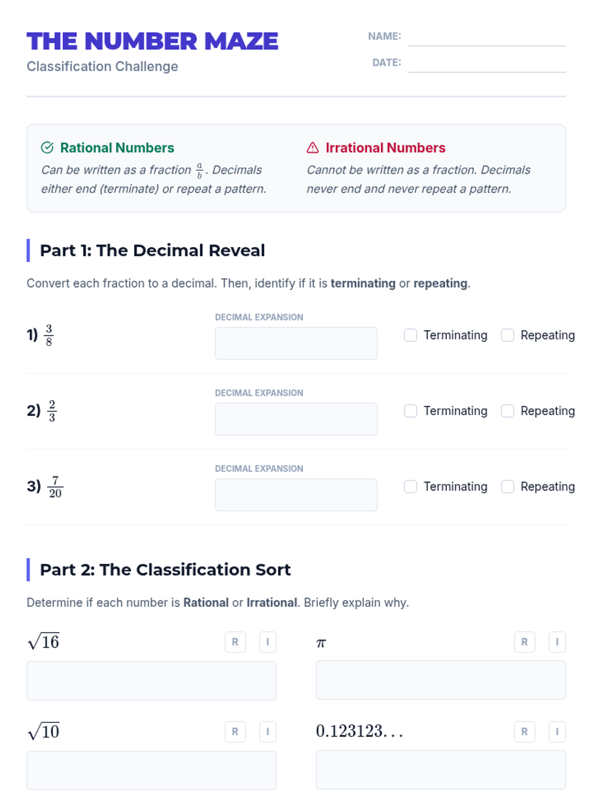A specialized intervention sequence designed for Grade 8 students to build a conceptual foundation in the real number system, focusing on the distinction between rational (repeating/terminating) and irrational numbers using CRA methods.