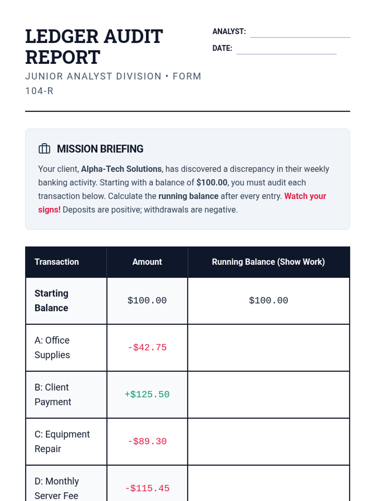 A 5-lesson unit where 8th-grade students act as financial analysts to master operations with rational numbers through real-world simulations of bank ledgers, stock markets, and debt division.