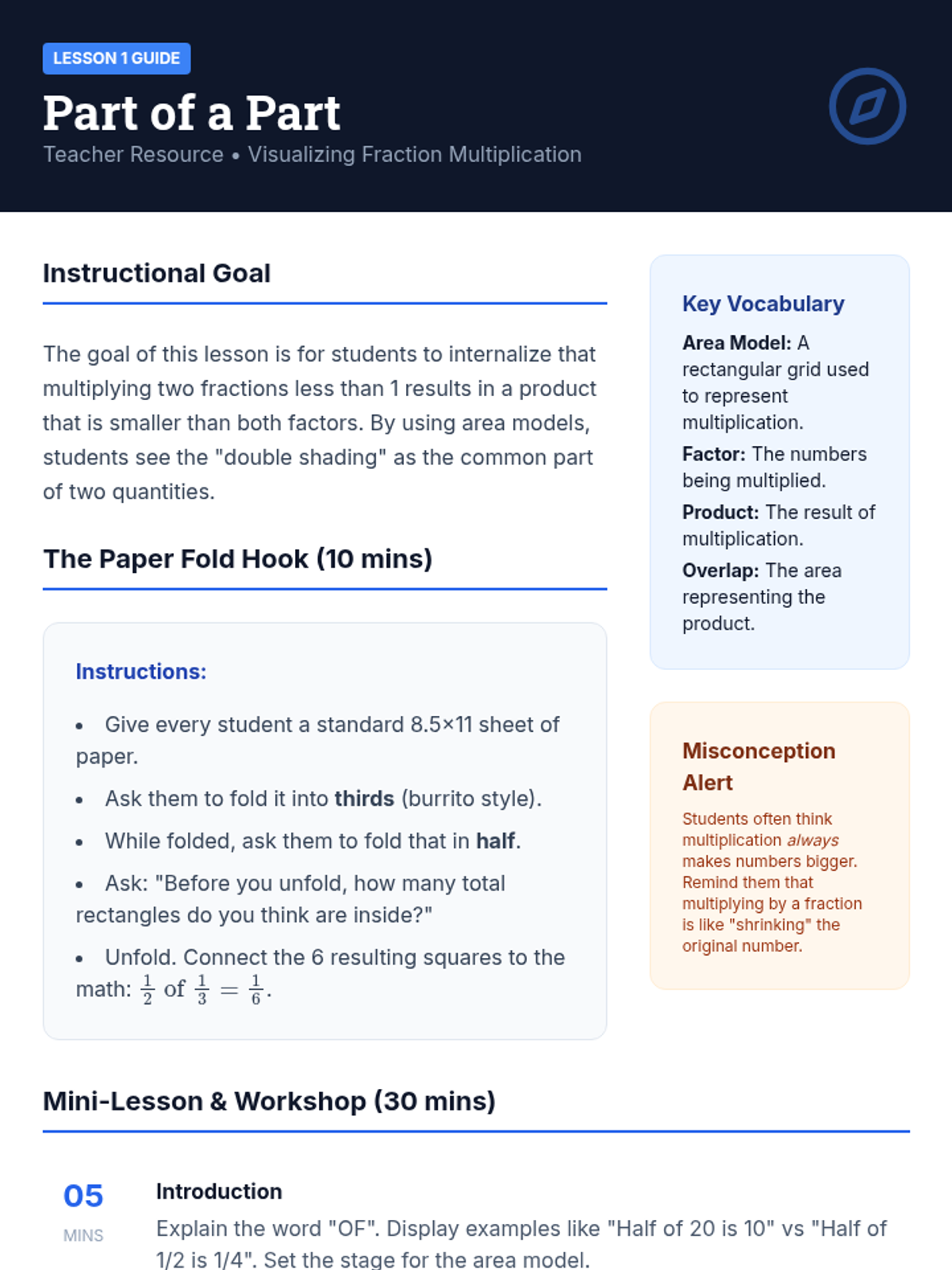 A comprehensive 7th-grade unit that builds a deep conceptual understanding of fraction division, moving from visual modeling to the standard algorithm and real-world application. Students investigate reciprocals, handle mixed numbers, and solve complex multi-step problems.
