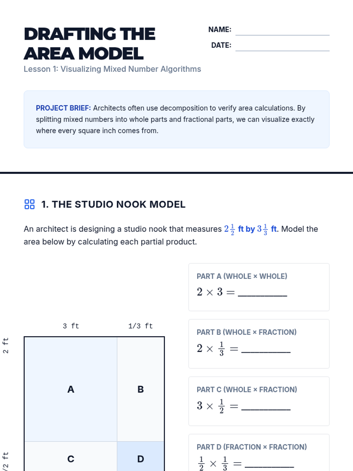 Students transition from rote arithmetic to applying fraction operations within the context of architectural design and resource management, culminating in a blueprint design project.