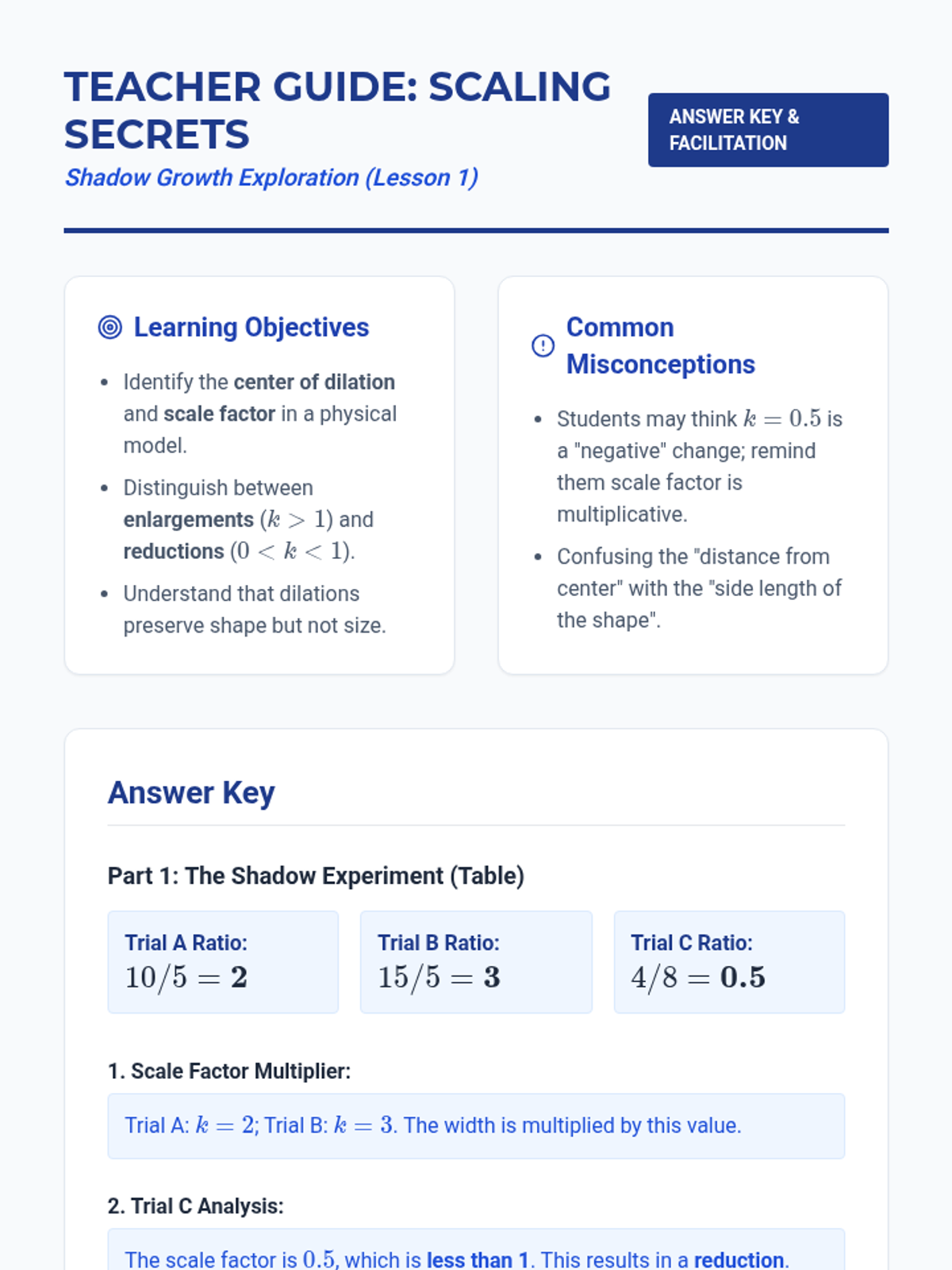 This 8th-grade geometry sequence explores dilations and similarity through an inquiry-based lens. Students move from physical shadows and movie projections to coordinate mapping, discovering that similar figures preserve angle measures while scaling side lengths proportionally. The unit culminates in using sequences of transformations to formally define and prove similarity.