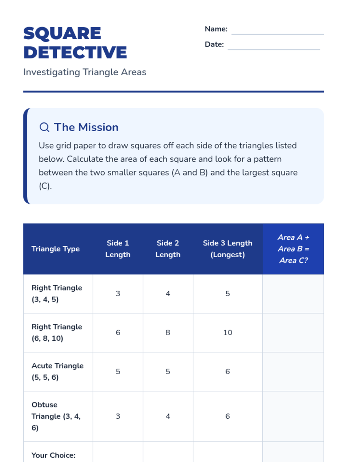 An inquiry-based exploration of the Pythagorean Theorem, moving from visual area models to algebraic application and error analysis. Students discover the relationship between side lengths of right triangles and apply it to real-world problems.