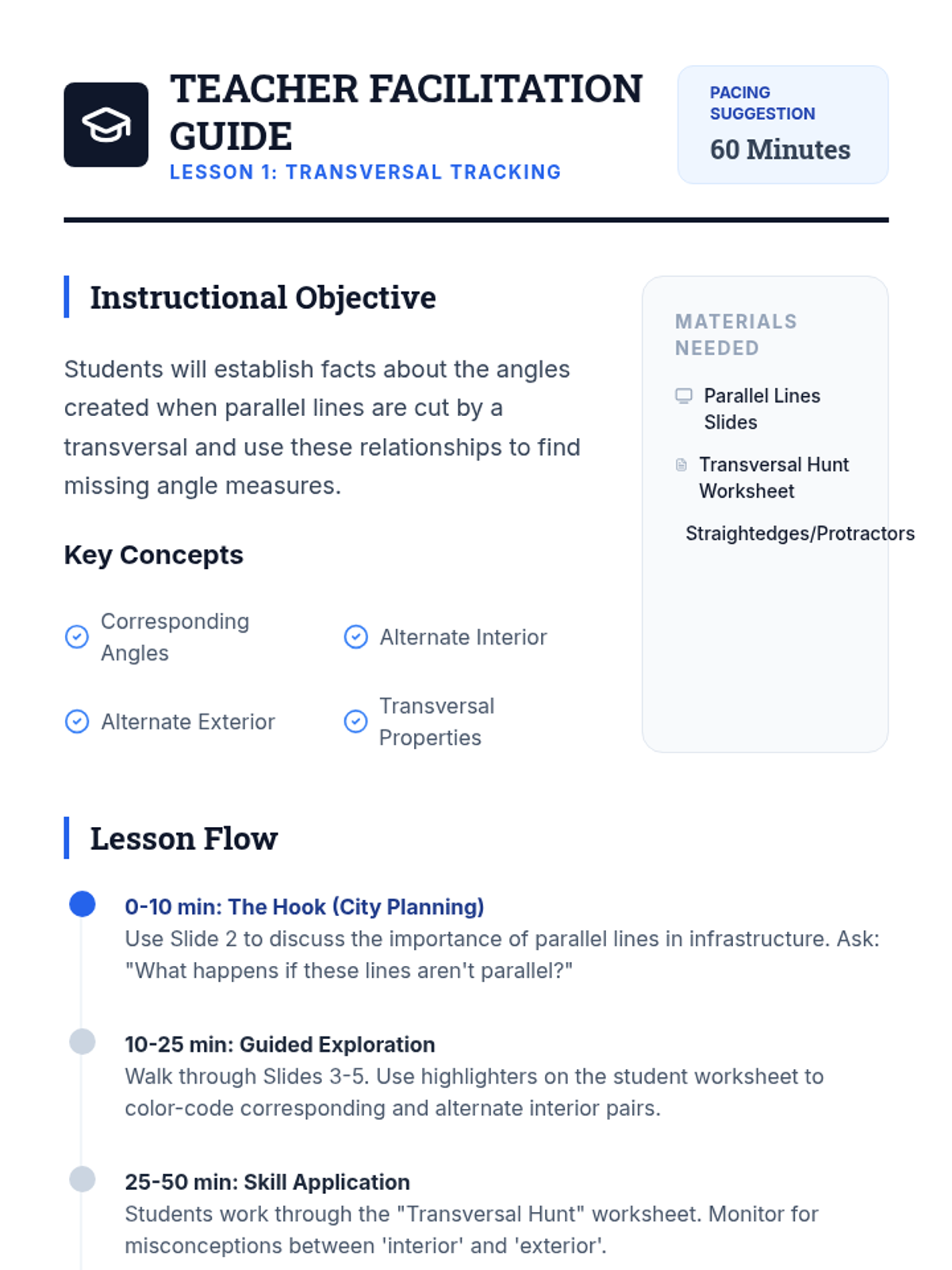 A comprehensive 8th-grade geometry unit that bridges the gap between parallel line properties and triangle similarity. Students explore transversals, interior/exterior triangle angles, and the AA similarity criterion to build rigorous geometric arguments.