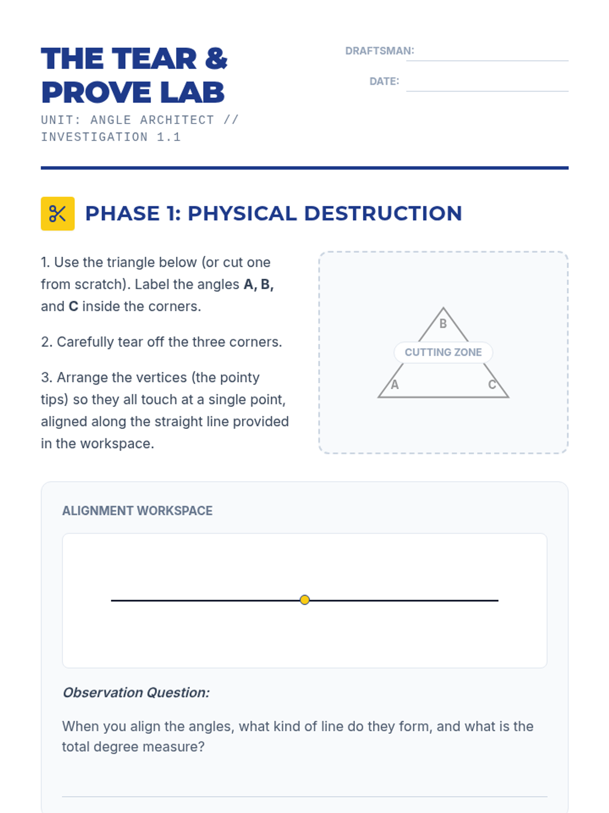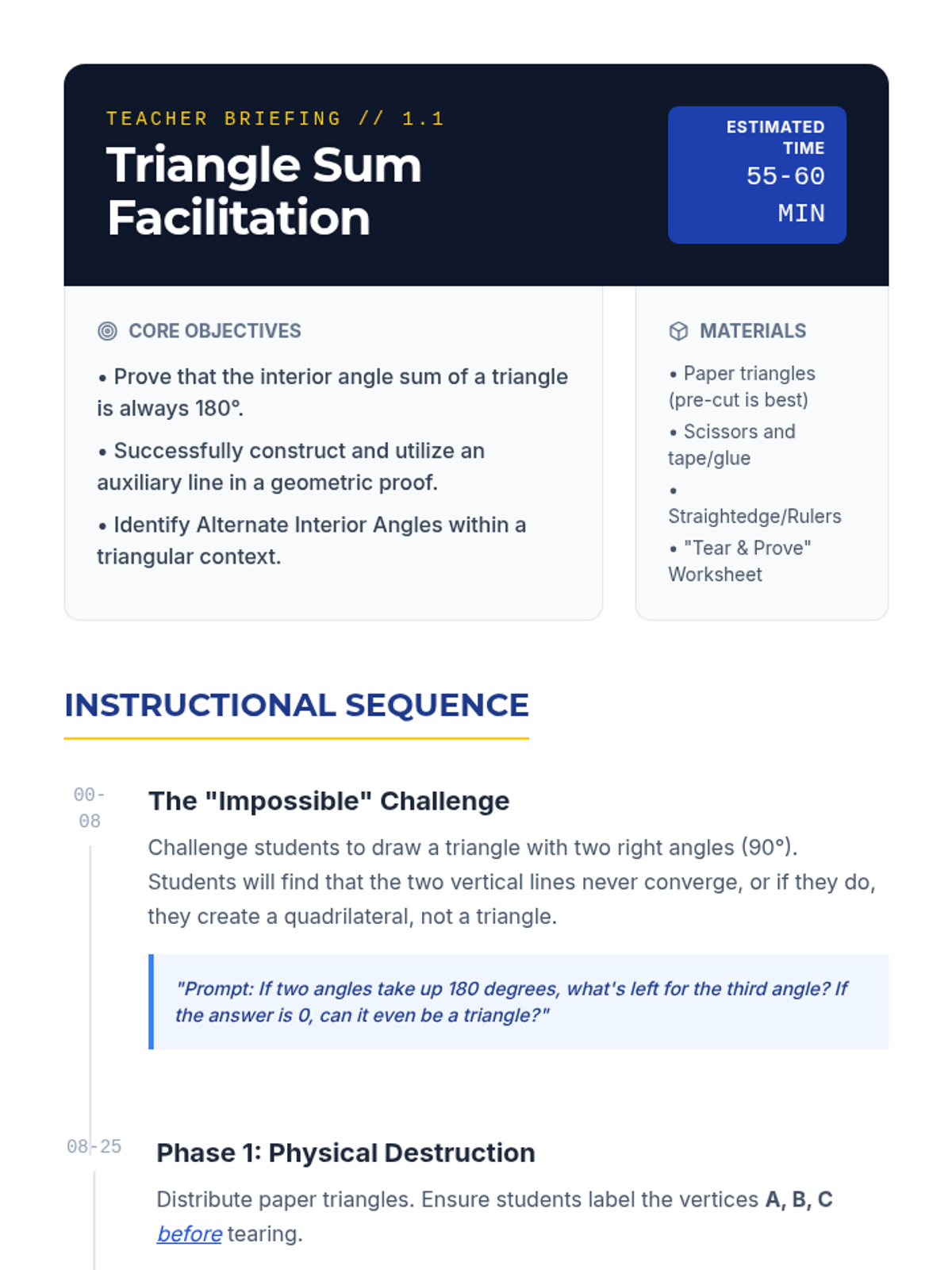 A comprehensive geometry unit for 8th-grade students focused on proving and applying triangle and polygon theorems through inquiry, visualization, and formal logic. Students transition from physical manipulation of shapes to rigorous deductive reasoning, mastering the Triangle Sum Theorem, Exterior Angle Theorem, and polygon interior angle formulas.