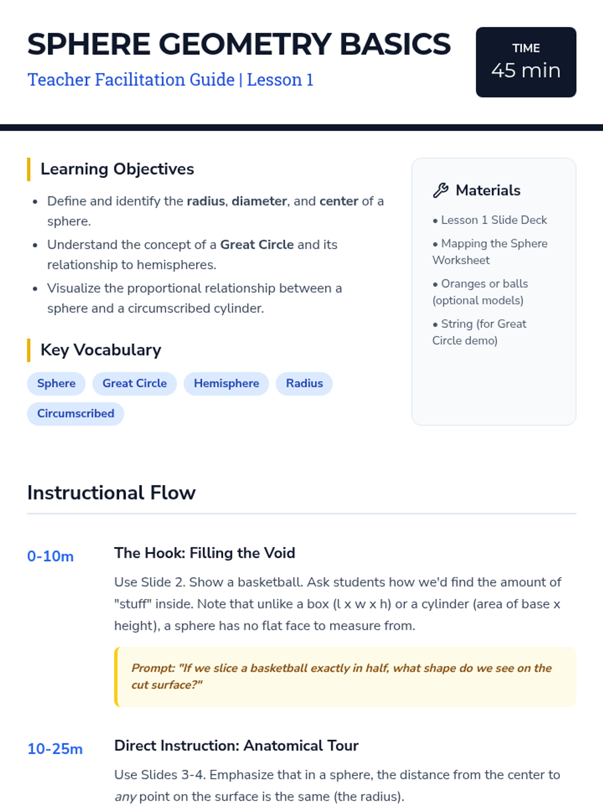 A comprehensive 8th-grade geometry sequence exploring the properties and volume of spheres, hemispheres, and their relationship to other circular solids through a mix of visual exploration and rigorous calculation.