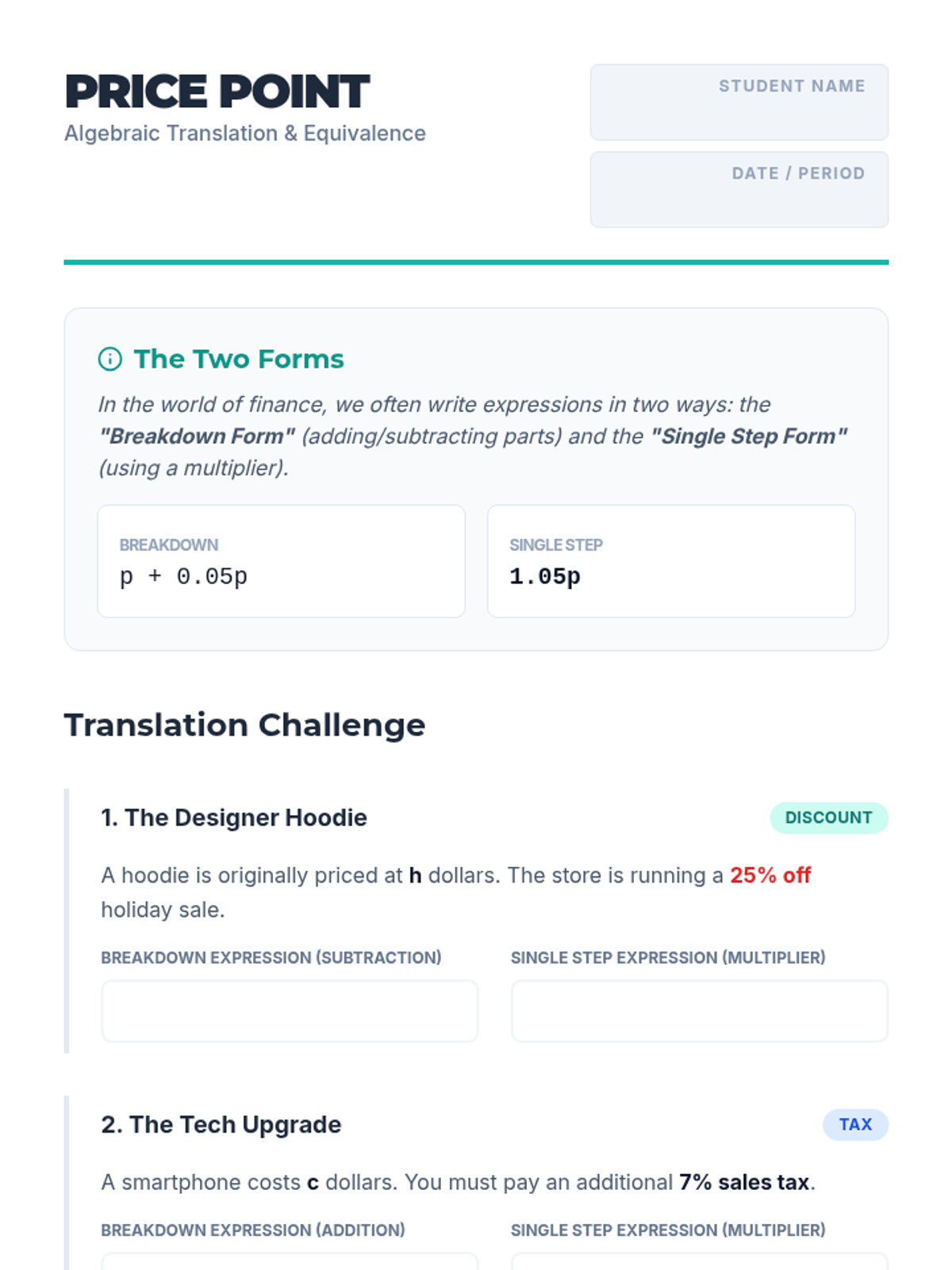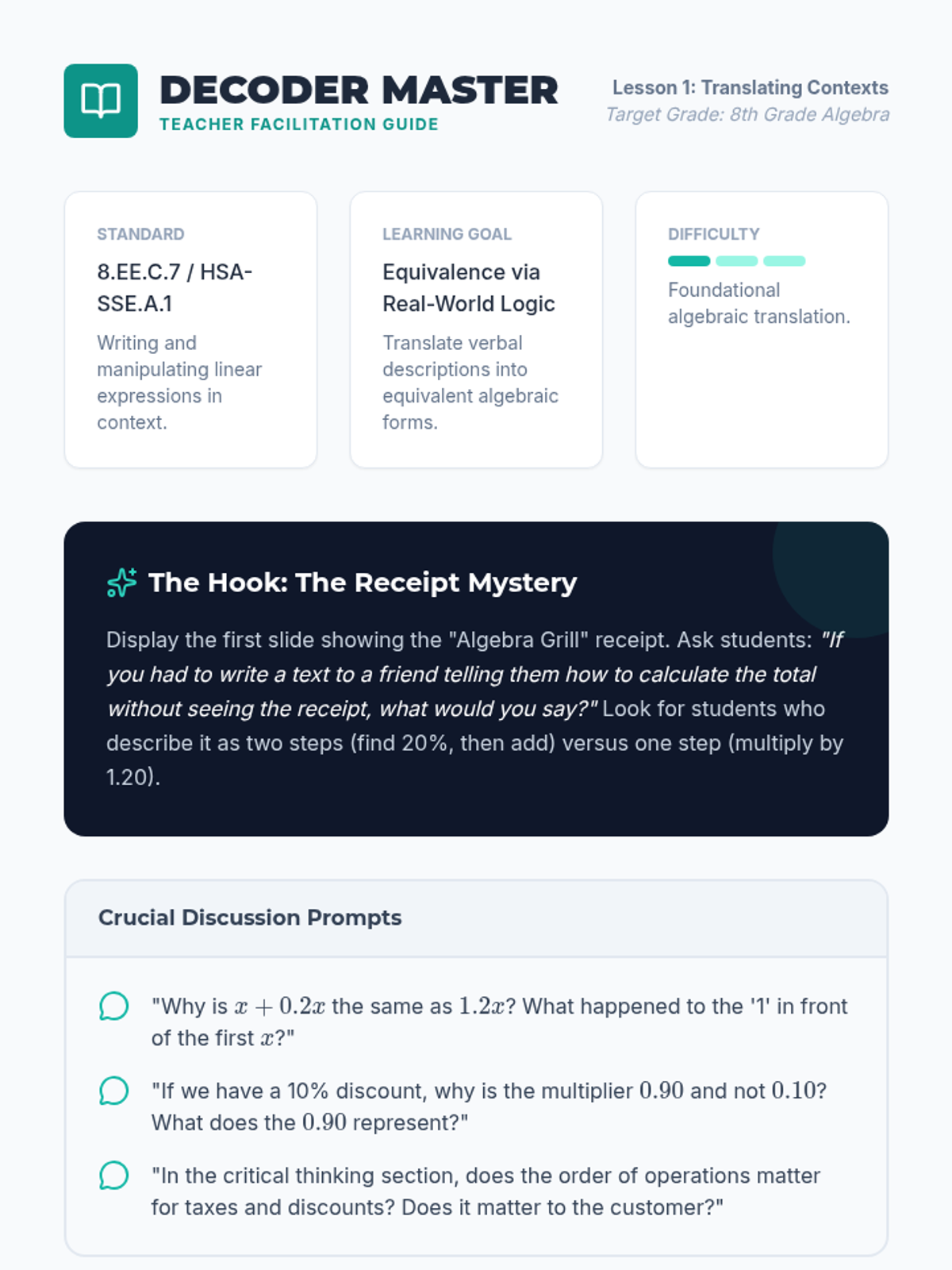 This 8th-grade algebra sequence bridges the gap between abstract expression manipulation and real-world utility. Students explore how rewriting expressions into equivalent forms (expanding, factoring, and simplifying) allows for more efficient calculations in business, geometry, and computer science contexts.