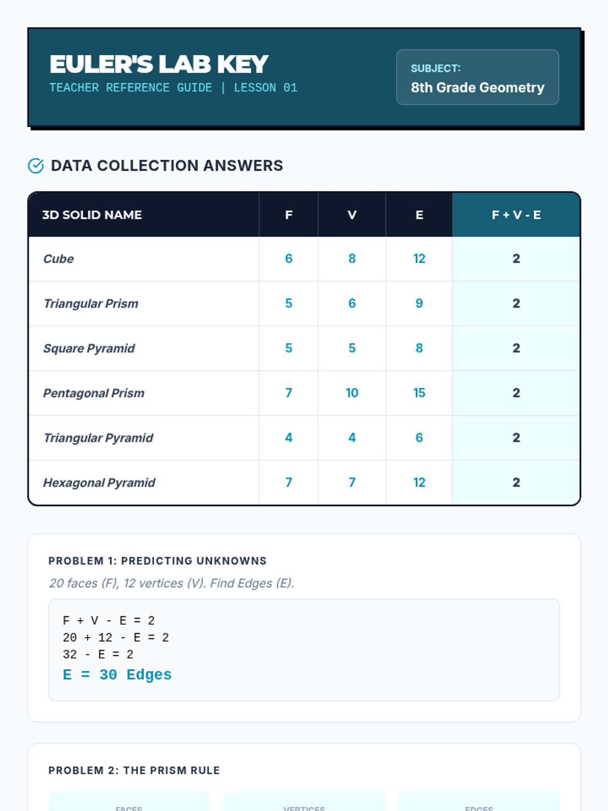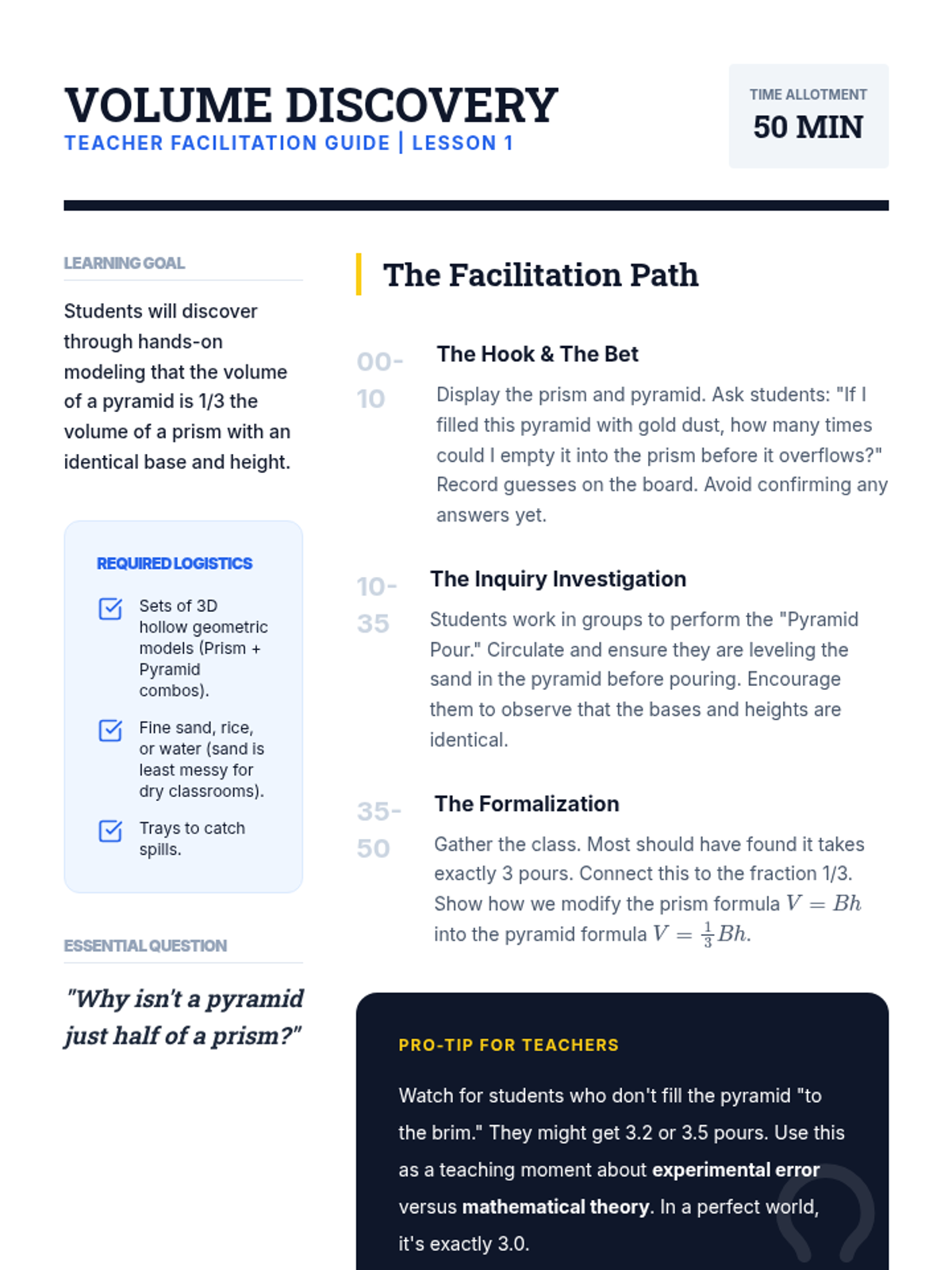 This inquiry-based sequence establishes the foundational conceptual understanding of volume as the accumulation of two-dimensional layers. Students move from counting unit cubes to deriving the universal formula V = Bh for prisms by exploring rectangular and triangular shapes.