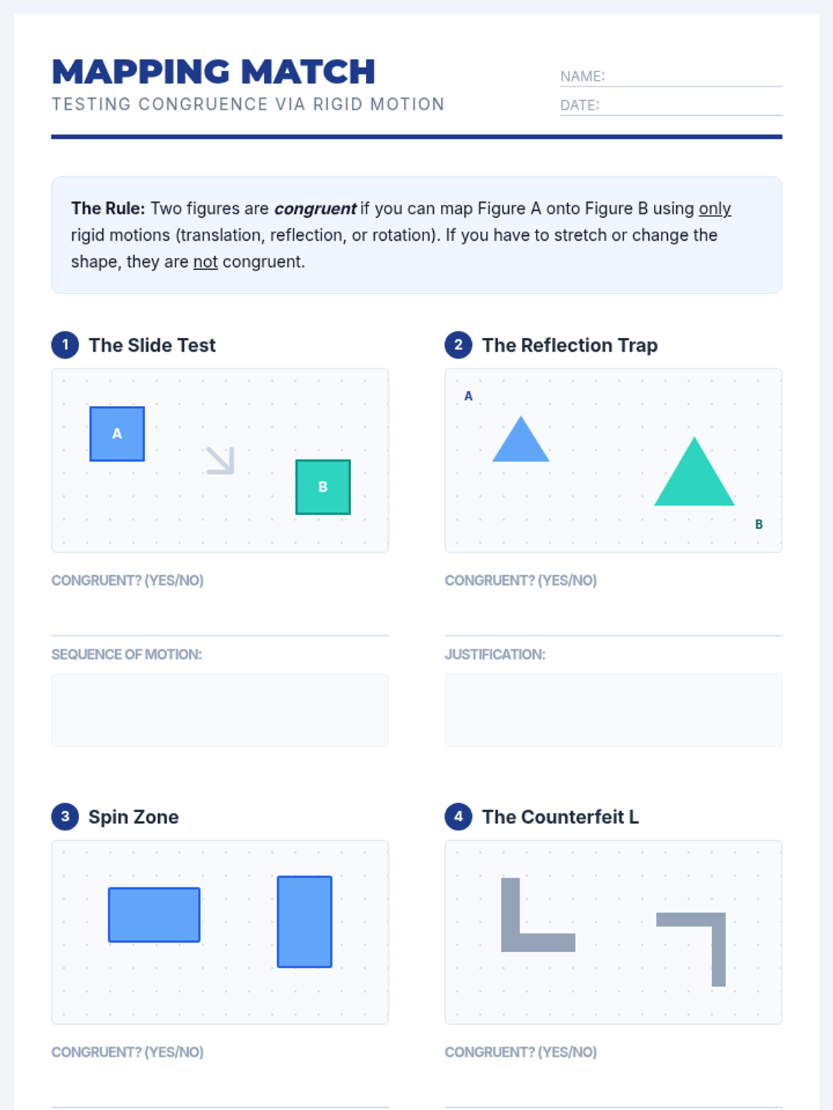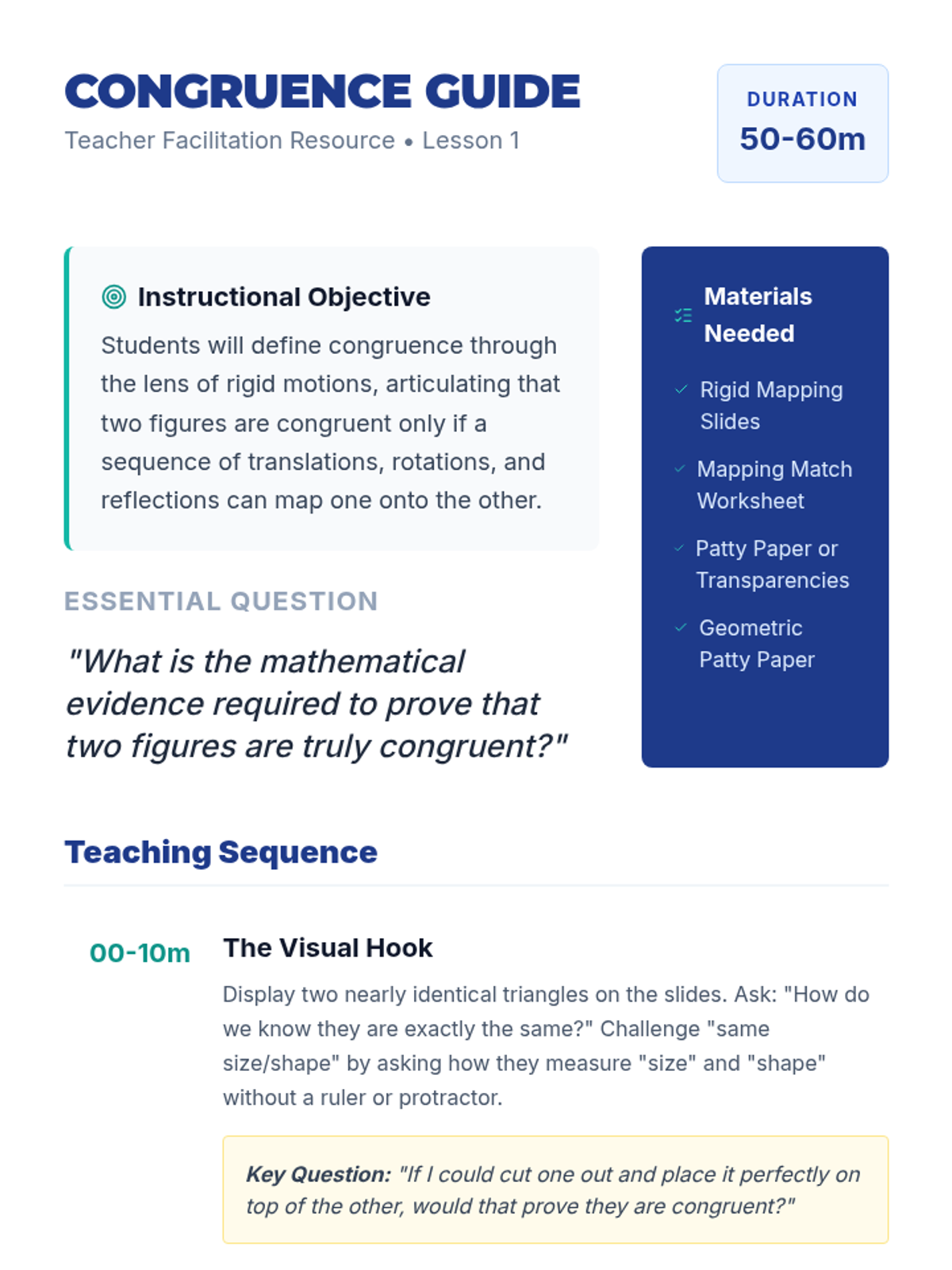 This 8th-grade geometry sequence bridges transformations and formal proofs by defining congruence through rigid motions. Students learn to map figures using translations, rotations, and reflections to prove identity, identify corresponding parts, and construct logical arguments.