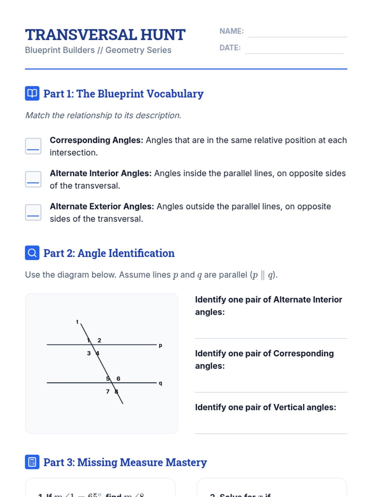 This sequence guides 8th-grade students through the logical discovery and formal proof of angle relationships formed by parallel lines and transversals. Students move from basic angle pairs to complex geometric modeling and algebraic proofs.