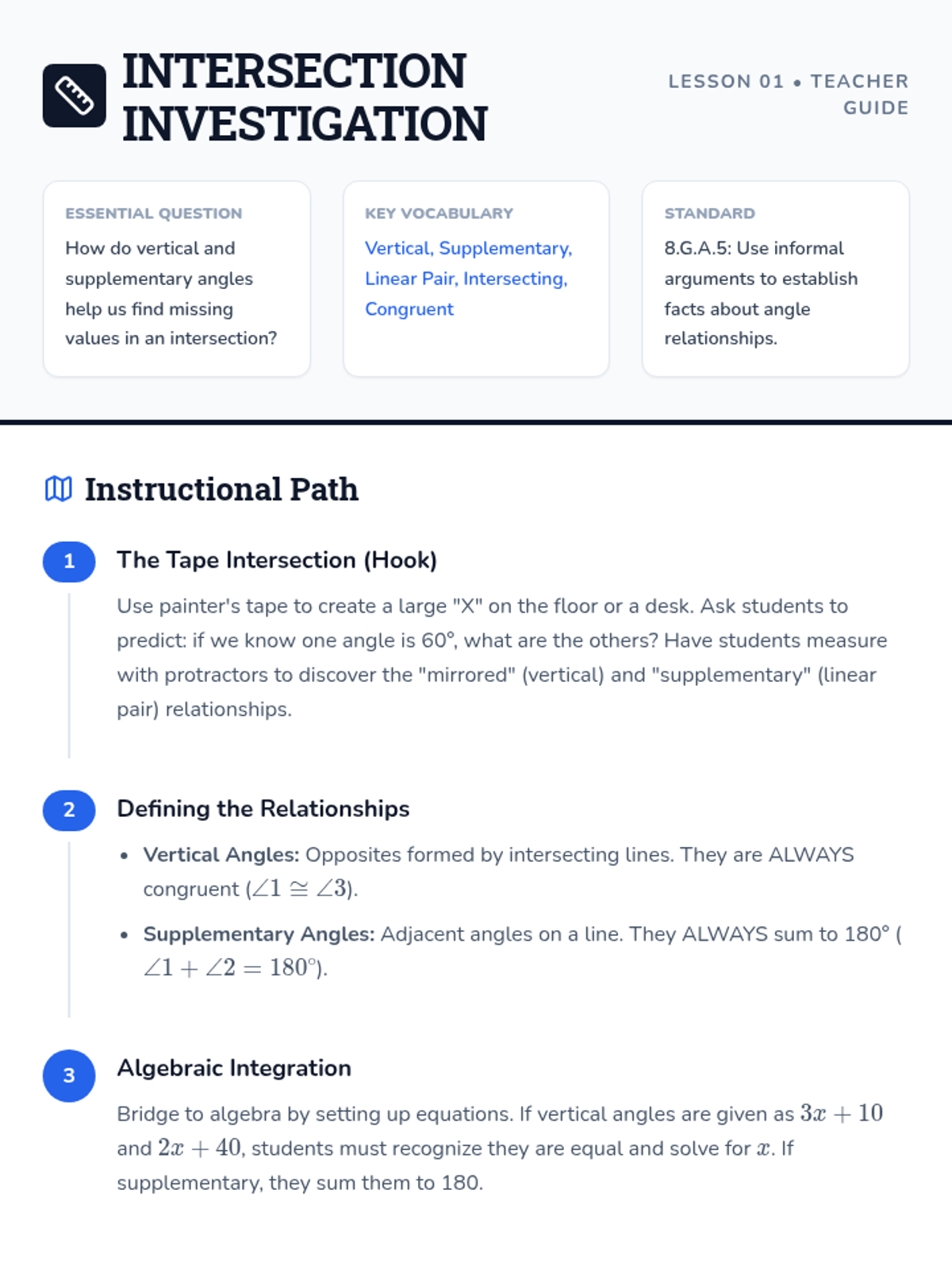 This 8th-grade sequence bridges the gap between geometry and algebra by using angle relationships to build and solve linear equations. Students progress from basic measurement to solving complex multi-step geometric puzzles involving unknown variables.