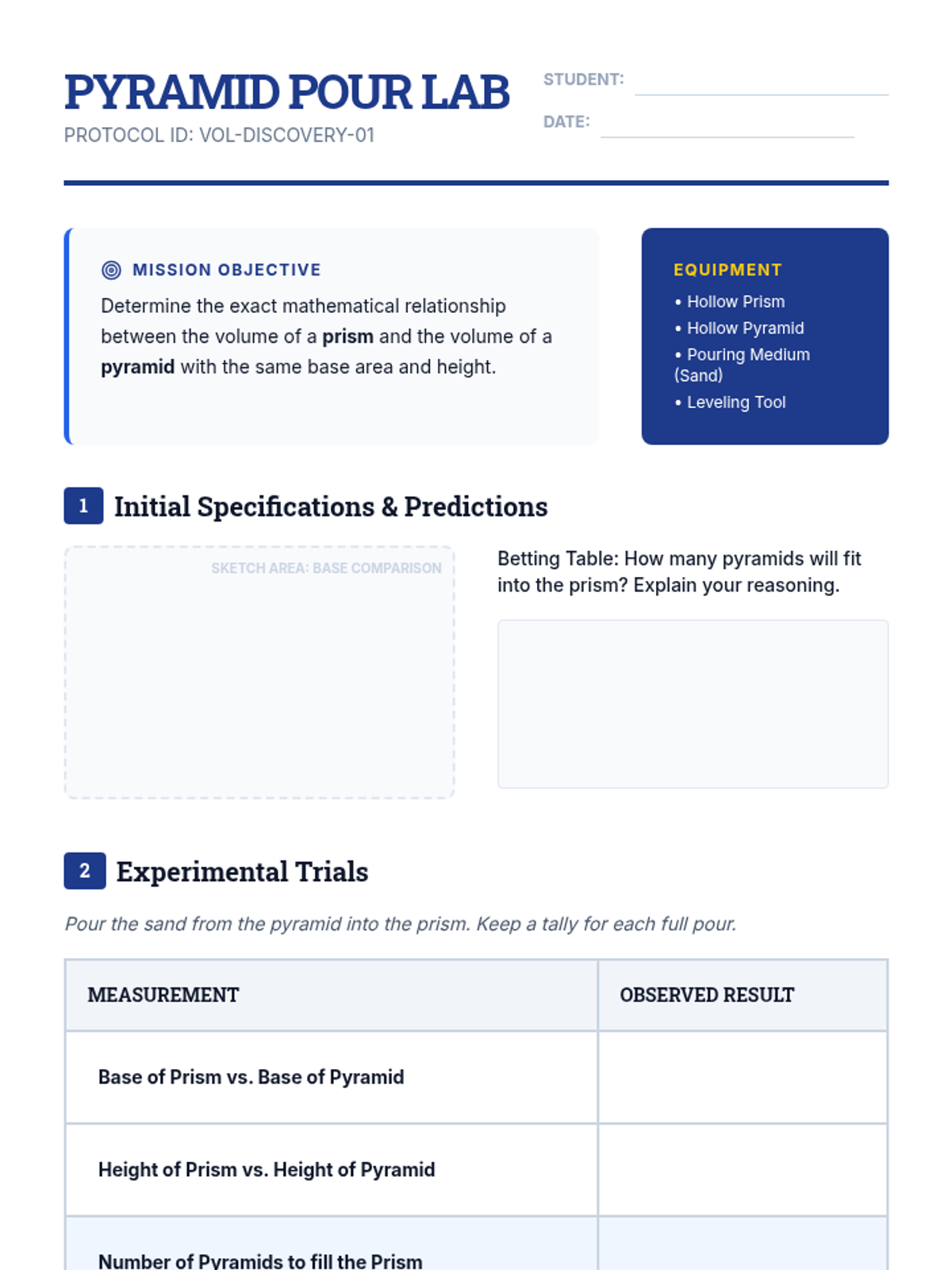 An inquiry-based exploration of the relationship between prisms/cylinders and pyramids/cones. Students derive volume formulas through experimentation and apply them to solve geometric problems.