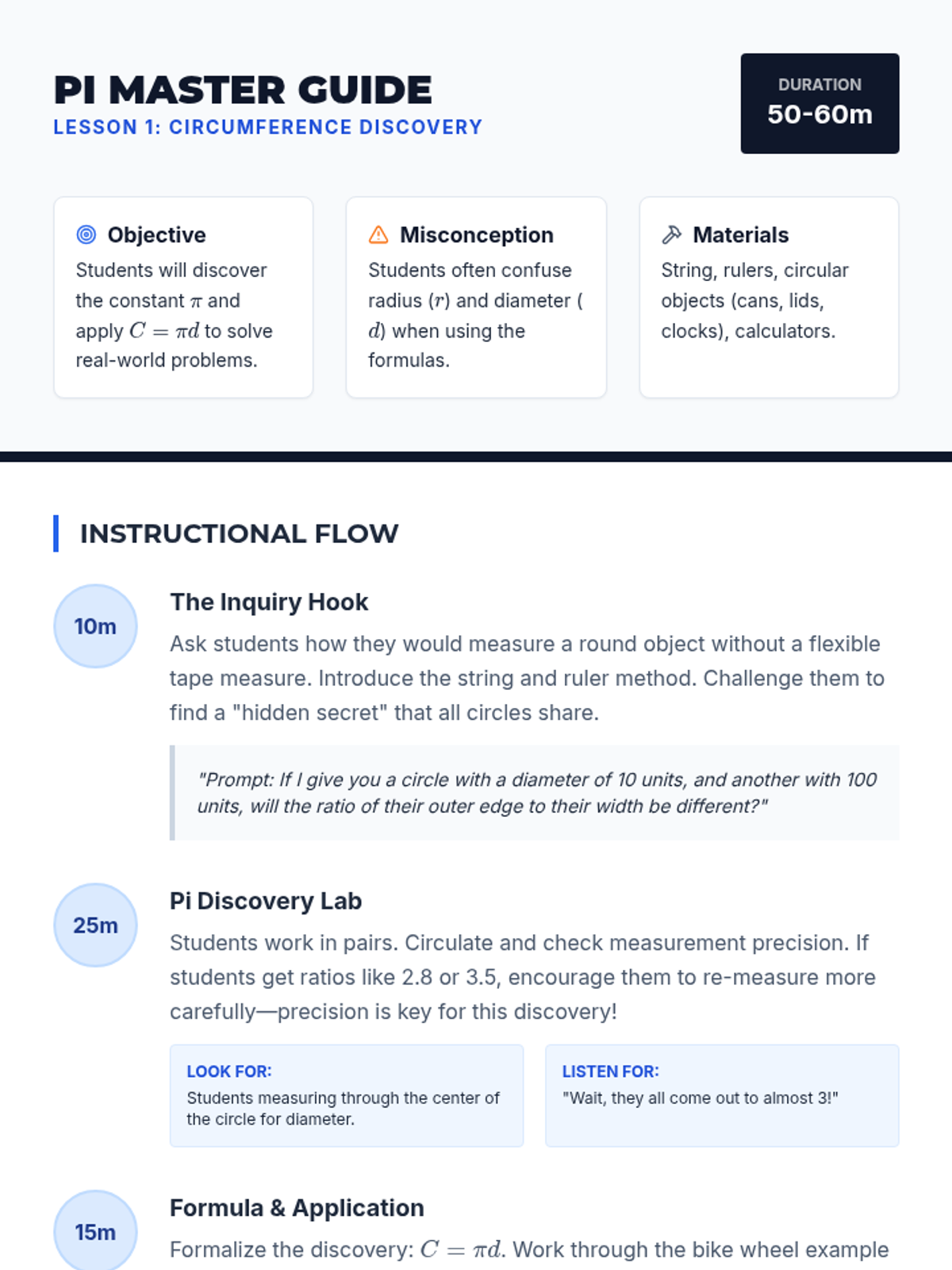 This geometry sequence guides 7th-grade students from circle area mastery to cylindrical volume calculations. It uses the concept of stacking circles to bridge 2D and 3D geometry, culminating in real-world engineering and packaging applications.