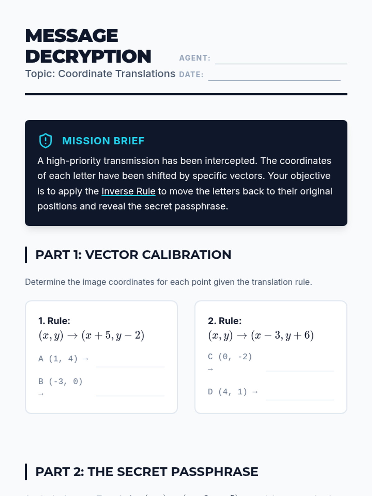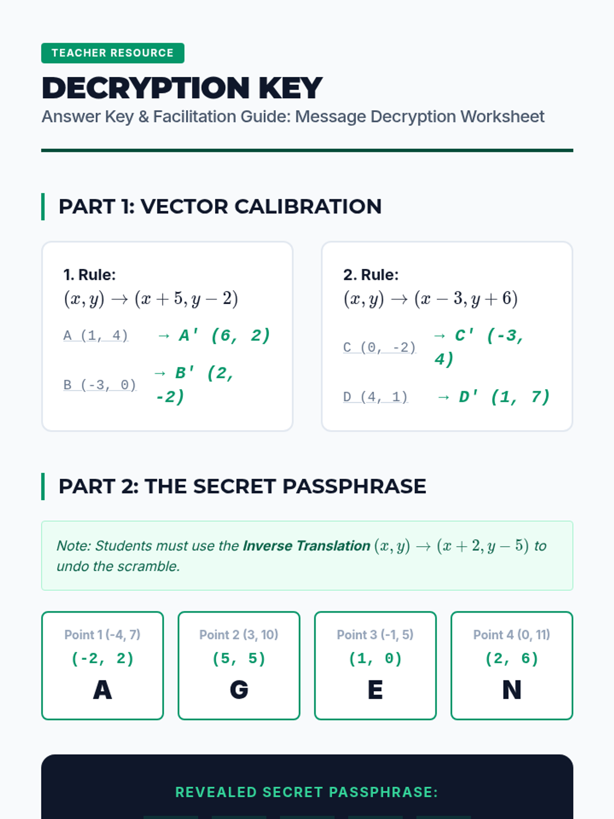 A 5-lesson geometry sequence where students master rigid motions on the coordinate plane. From translations to complex rotations, students learn to express geometric changes as algebraic functions and verify congruence using the distance formula.