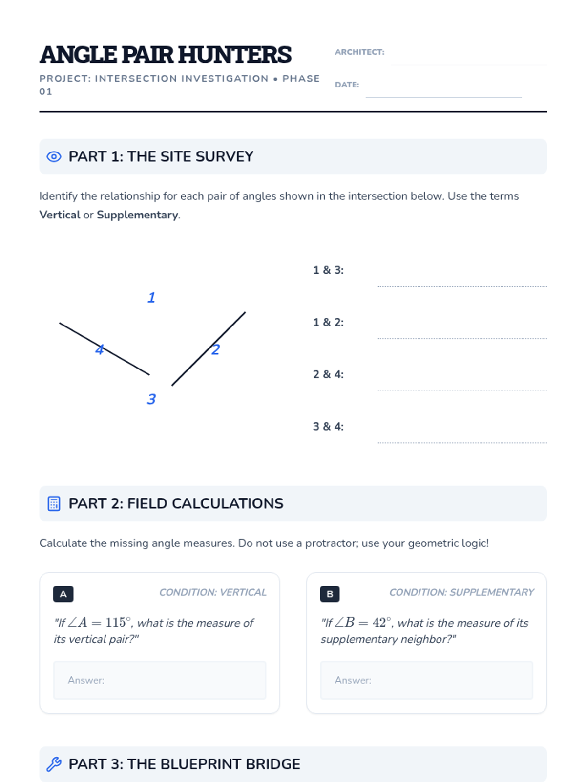 A project-based 8th-grade sequence where students act as structural engineers and architects. They apply angle concepts (complementary, supplementary, vertical, adjacent) to design and verify the structural integrity of bridges and trusses.