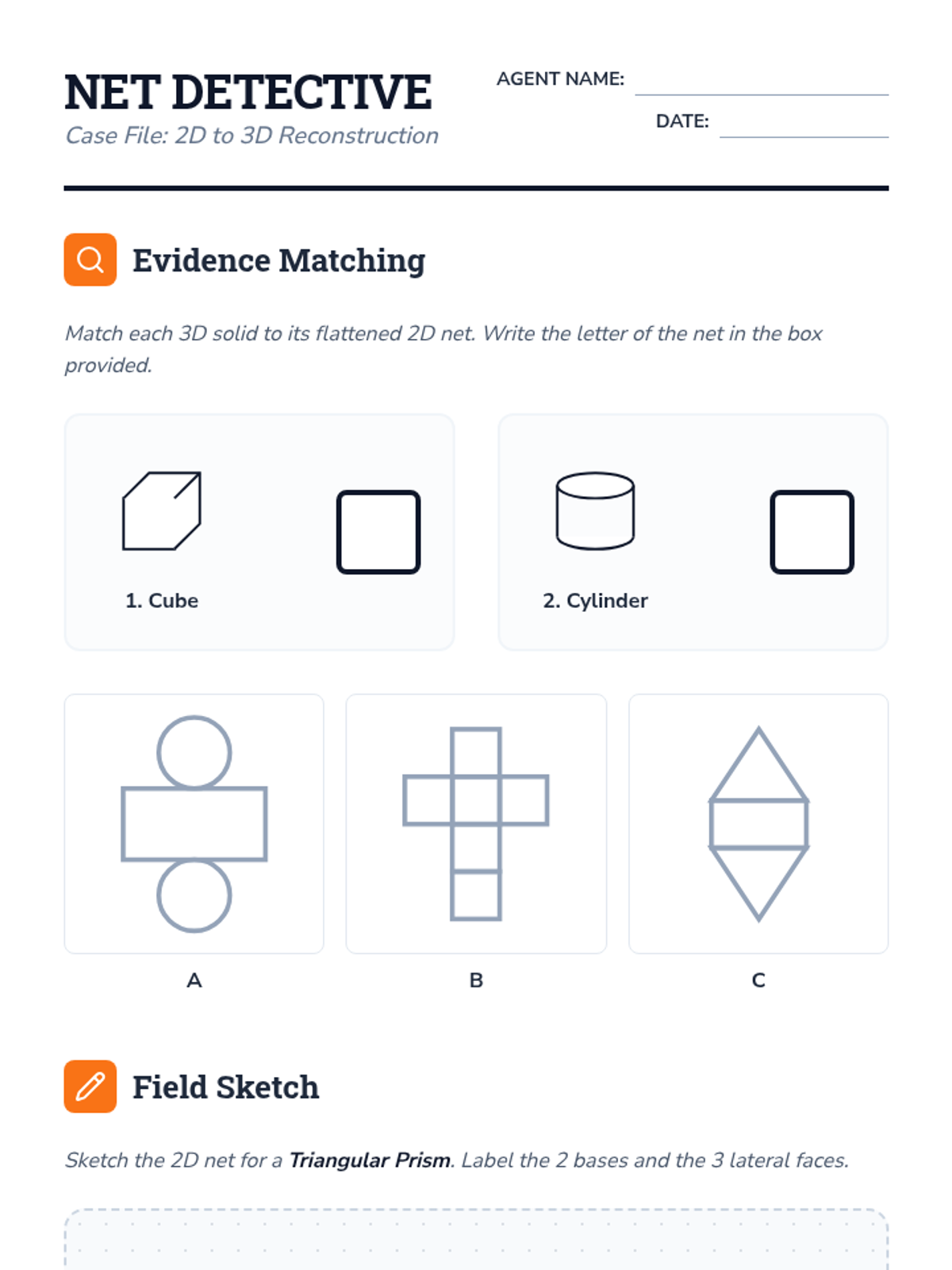 This hands-on sequence focuses on spatial visualization, specifically the relationship between three-dimensional solids and two-dimensional figures. Students explore how slicing 3D objects creates 2D cross-sections, progressing from basic classification to complex angled cuts and orthographic projections.
