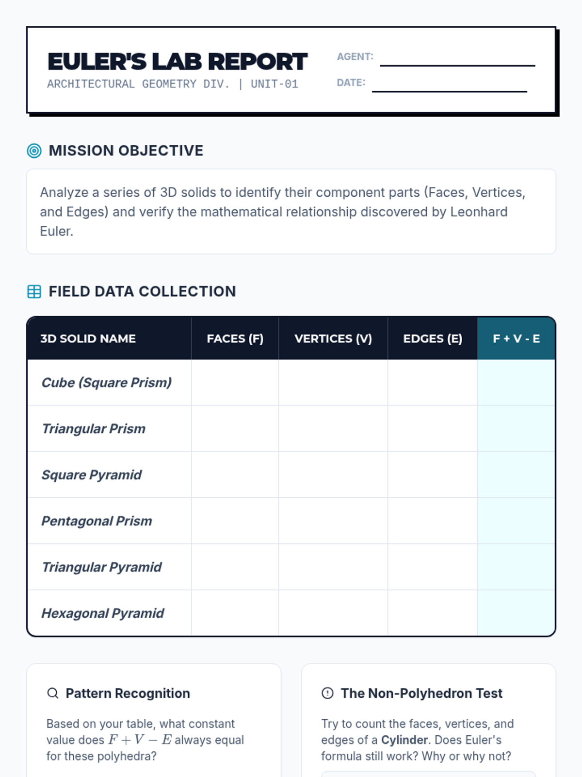 A rigorous exploration of geometric classification, focusing on logical hierarchies of quadrilaterals, properties of diagonals, 3D polyhedra attributes via Euler's Formula, and the visualization of cross-sections. Students move from visual identification to formal geometric reasoning and proof construction.