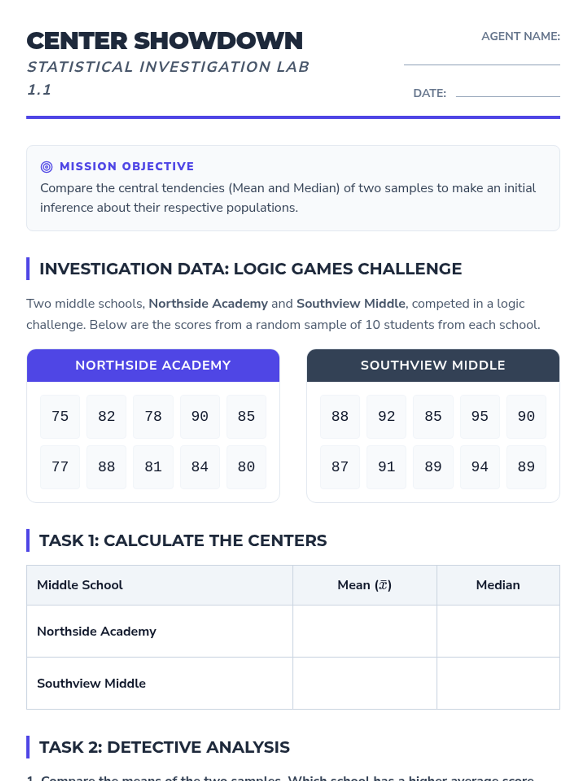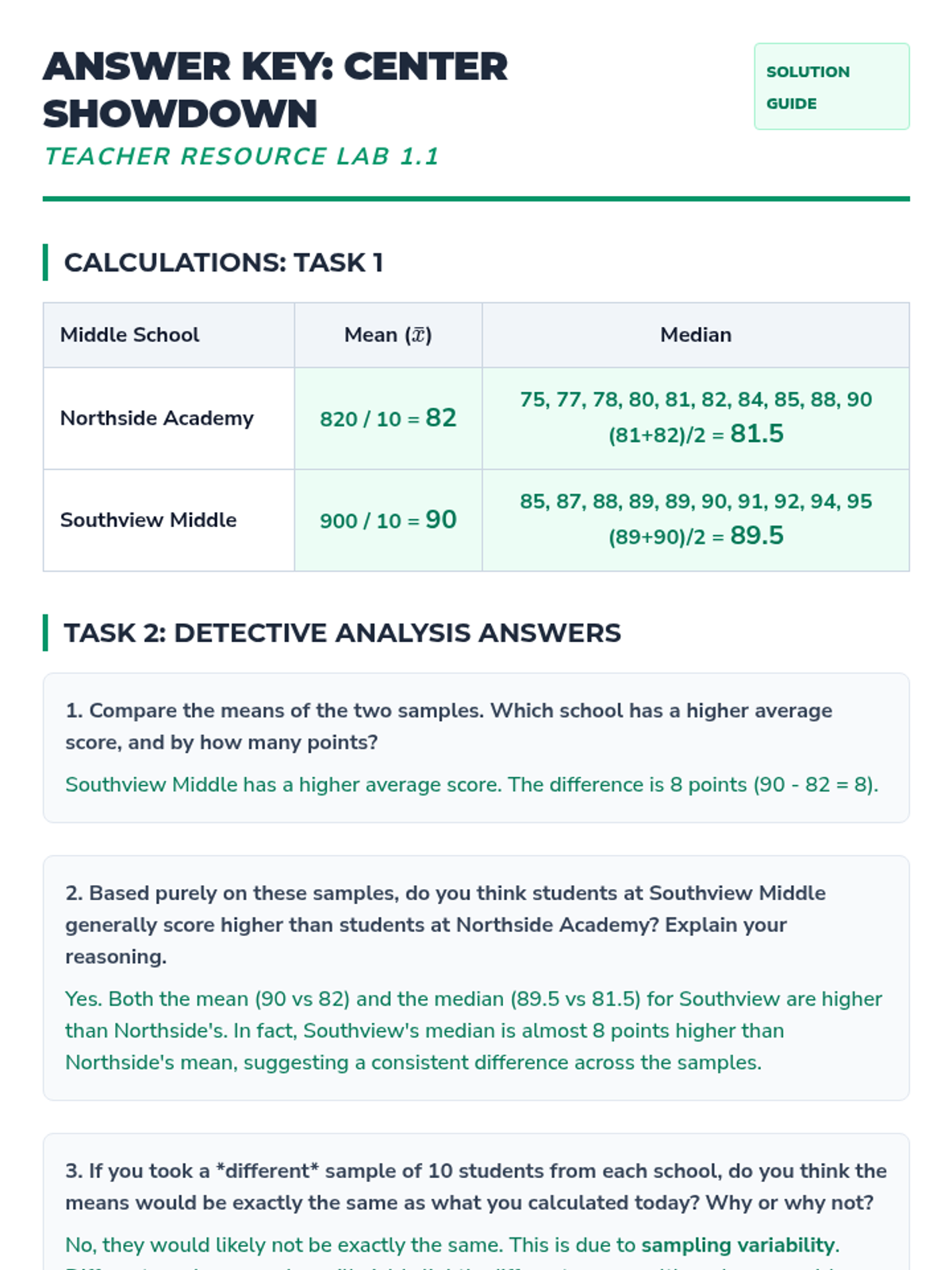 A targeted intervention sequence focused on helping students use measures of center and variability to compare two different populations from sample data. Students engage in scaffolded calculations and collaborative projects to build statistical reasoning.