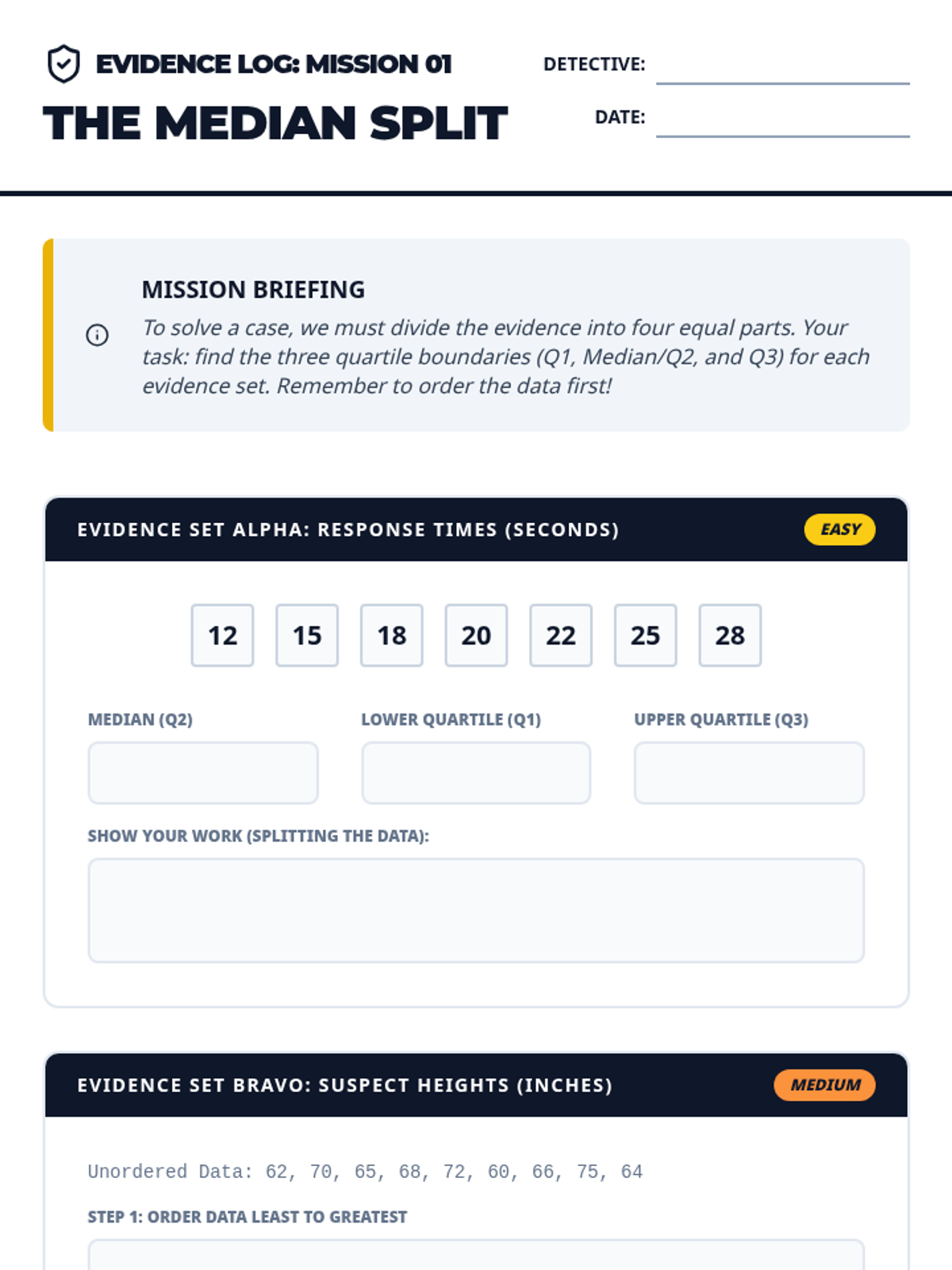 A comprehensive 7th-grade unit on statistical variability, focusing on quartiles, interquartile range (IQR), and the construction and interpretation of box plots using a detective-themed 'Data Detectives' aesthetic.