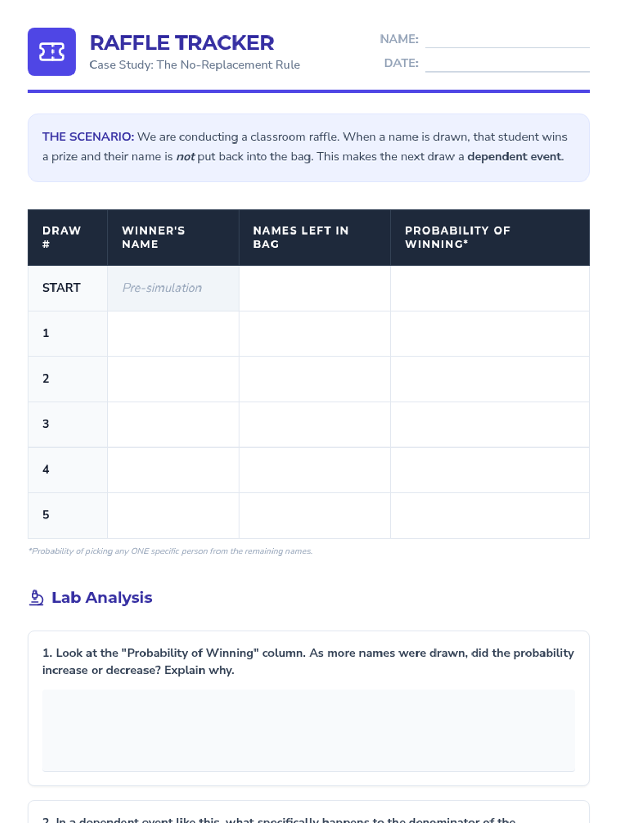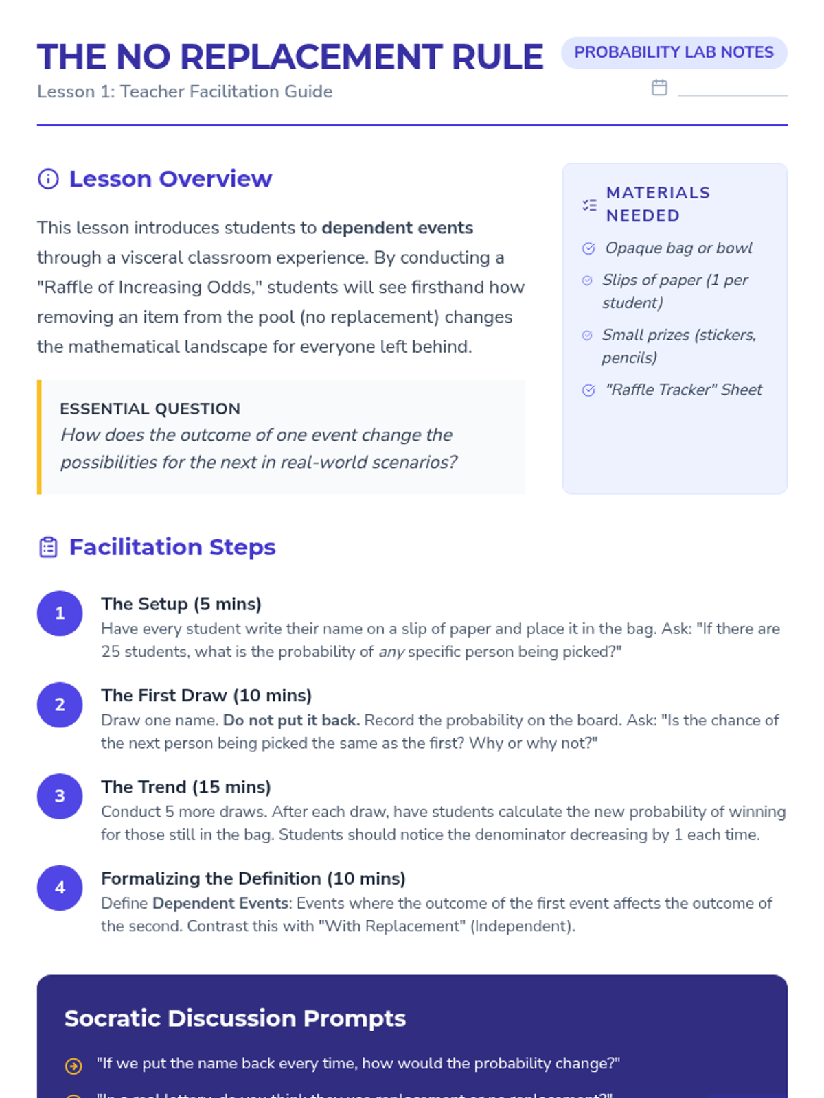 A comprehensive 5-lesson sequence on dependent probability for 8th Grade students, moving from hands-on simulations to complex real-world case studies. Students master the logic of 'without replacement' and learn to distinguish between independent and dependent event types.