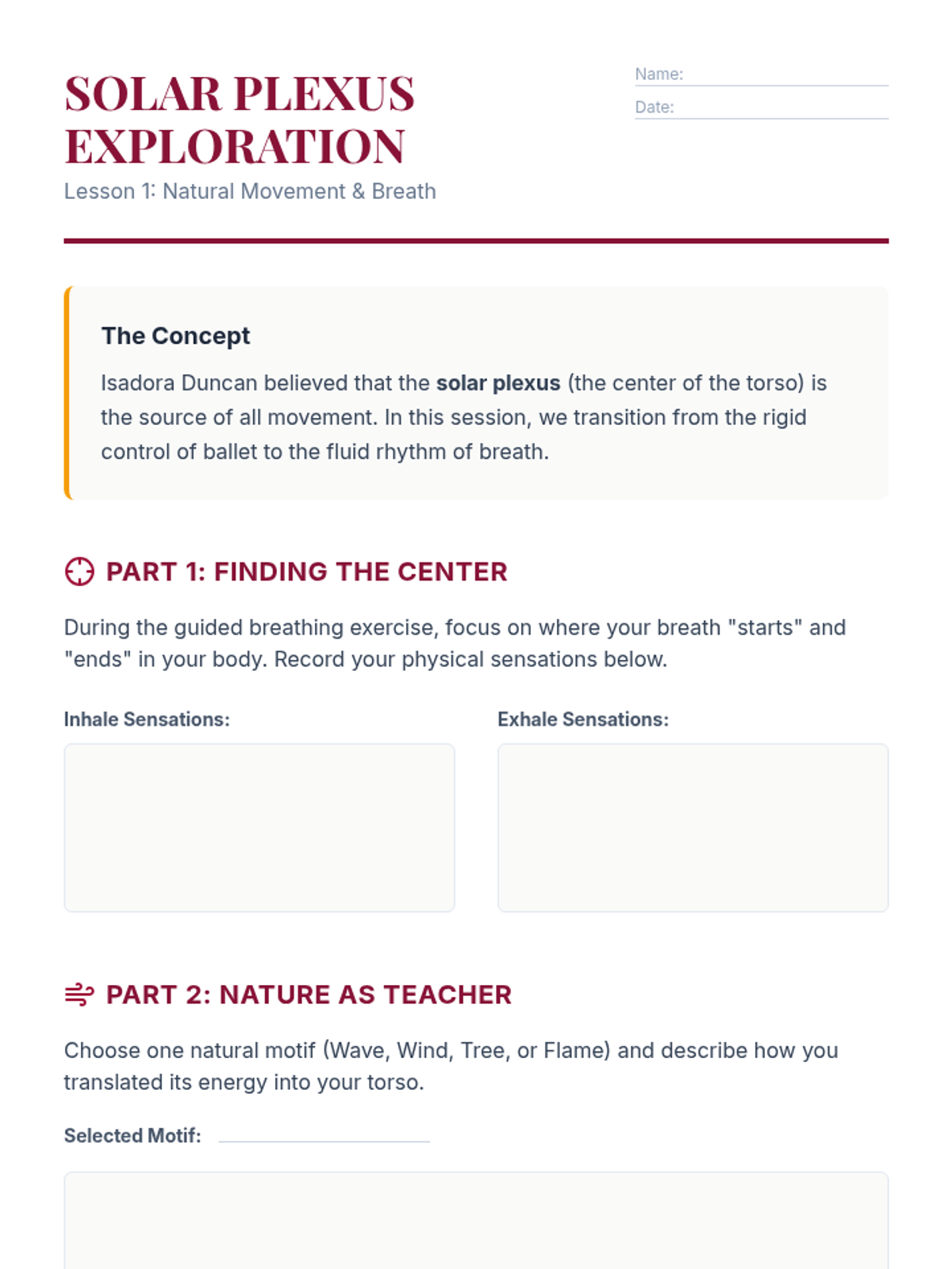 A high school sequence exploring the shift from traditional ballet to modern dance through five key movements: Duncan's naturalism, Graham's psychological depth, Cunningham's chance operations, Judson Dance Theater's pedestrianism, and Bausch's Tanztheater. Students engage in both physical workshops and intellectual analysis to understand art as a reaction to its time.