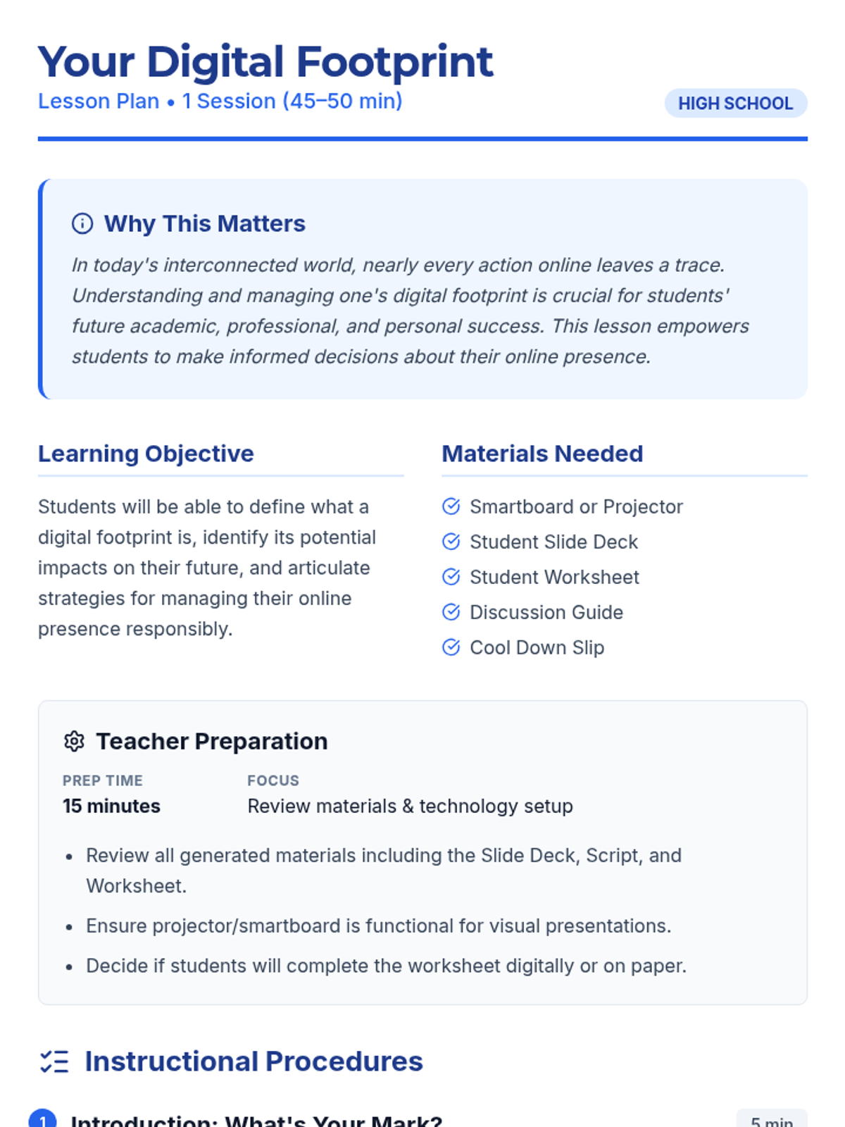 A sequence of lessons designed to prepare high school students for post-secondary life by mastering their online presence and developing essential self-advocacy skills. Students will learn to manage their digital reputation and effectively communicate their needs in academic and professional settings.