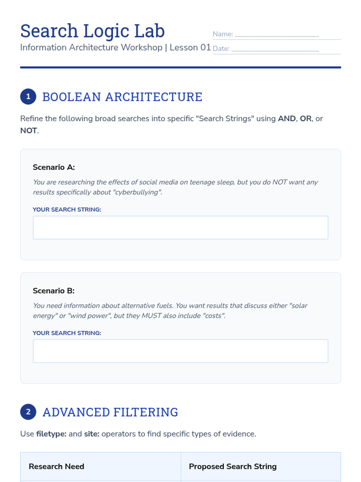 This sequence equips 9th-grade students with professional information retrieval skills, moving from basic keyword searches to complex Boolean logic, advanced search syntax, and academic database navigation. Students will learn to manipulate search algorithms and document their research process to locate high-quality, obscure information efficiently.