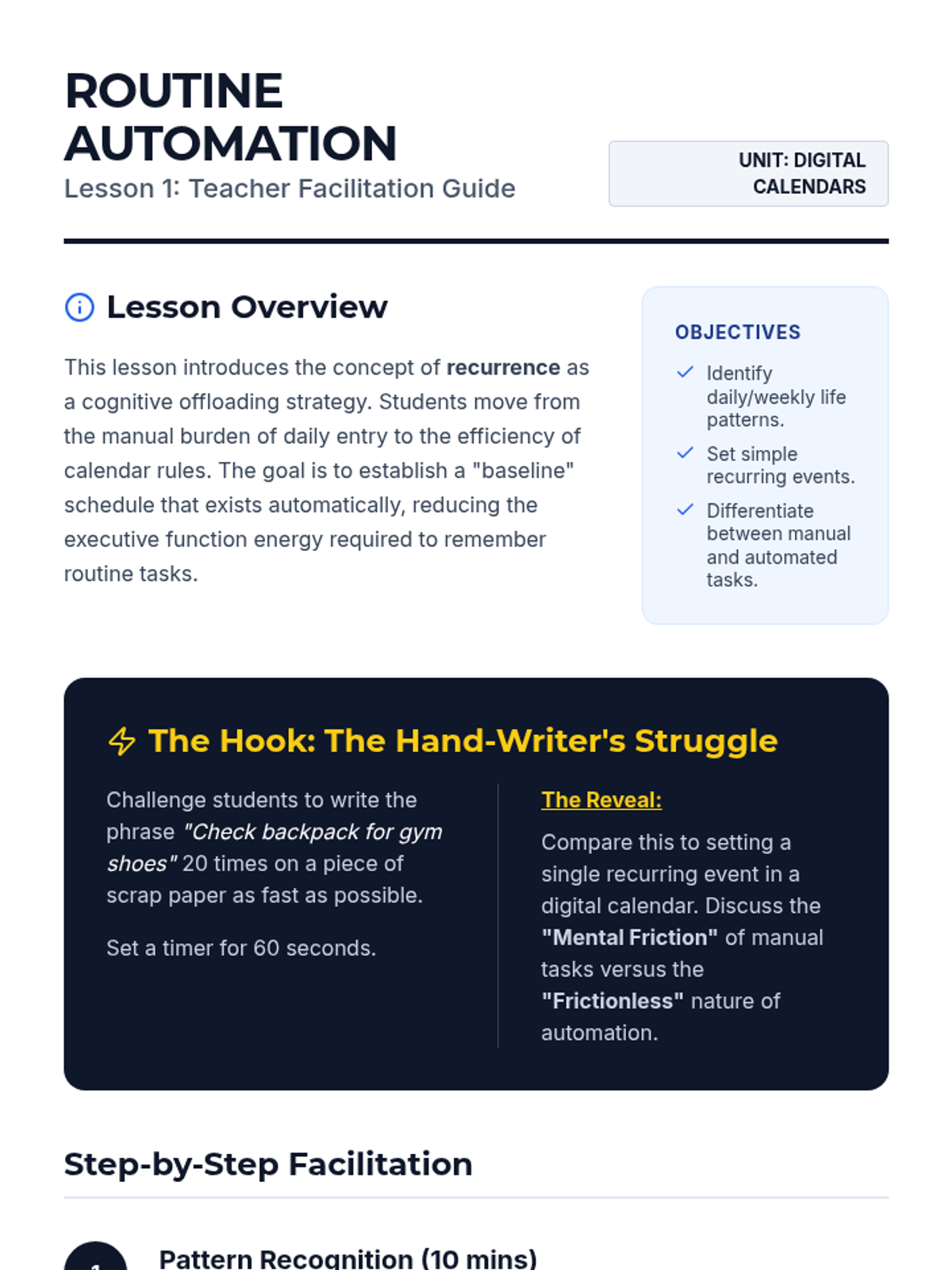 A specialized sequence for 9th-grade students focusing on using digital calendar automation (recurring events and smart alerts) to support executive function and memory. Students move from basic repetition to complex A/B scheduling and multi-layered reminder systems.