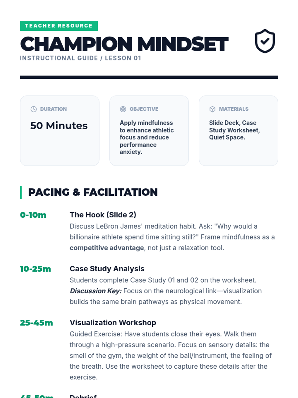 A high-impact mindfulness sequence for 9th graders focusing on applying meditation techniques to sports, academics, social dynamics, and digital life to enhance performance and resilience.