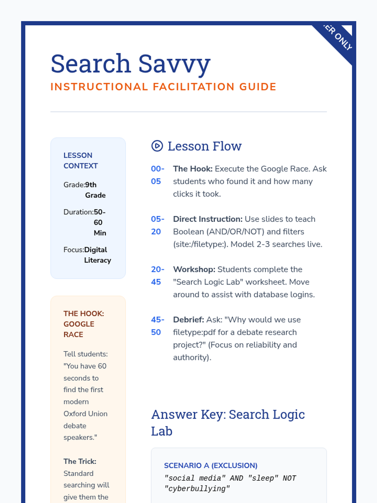 This sequence bridges the gap between open-web searching and academic research by introducing 9th-grade students to digital databases and advanced search strategies. Students progress from understanding the 'Deep Web' to mastering Boolean logic and evaluating scholarly authority, culminating in a research curation simulation.