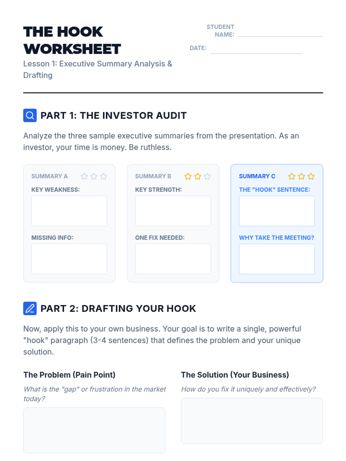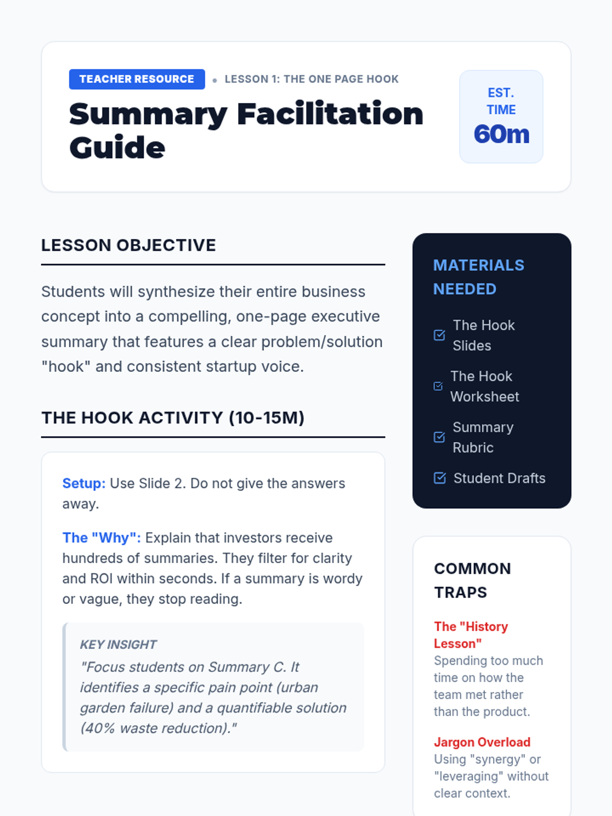 A comprehensive 9th-grade sequence that guides students through the final stages of business planning: writing executive summaries, synthesizing full plans, visualizing data, and designing/delivering a professional pitch deck. Students move from technical writing to persuasive presentation, culminating in a formal business pitch.