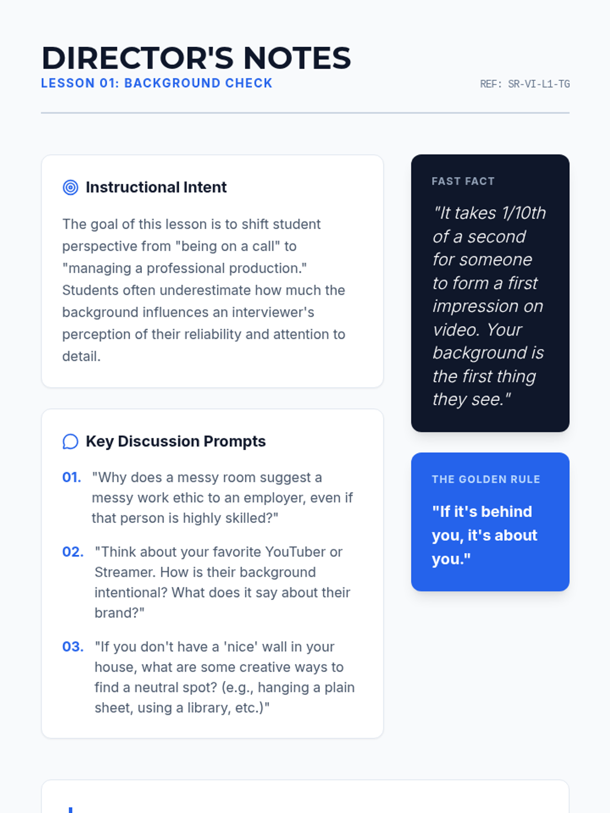 A comprehensive 5-lesson sequence for 9th graders focusing on the technical and environmental aspects of professional virtual interviews, from background composition to lighting, audio, and framing.