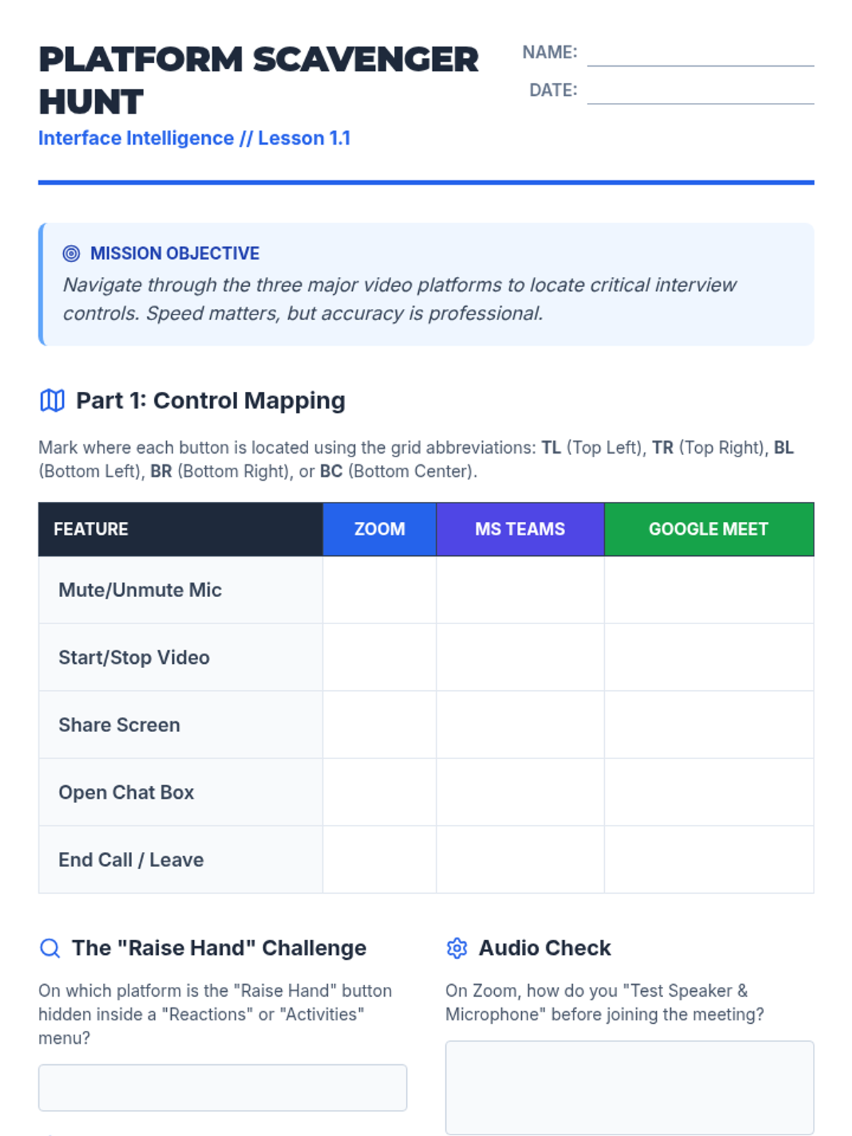 A comprehensive 5-lesson unit designed to help 9th-grade students master the technical aspects of virtual interviews. Students learn platform navigation, troubleshooting protocols, screen-sharing etiquette, and crisis management through hands-on simulations and interactive guides.