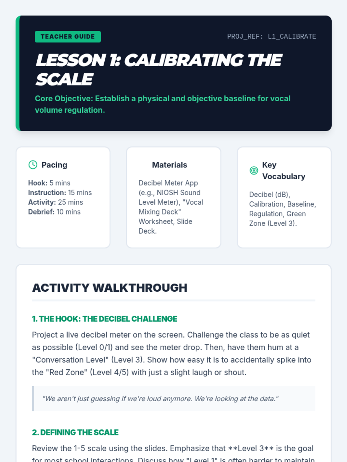 A 5-lesson sequence for 9th-grade students focusing on social communication through the lens of volume and tone regulation. Students will move from basic calibration of their 'internal volume knob' to high-stakes social and vocational simulations requiring rapid adaptation.