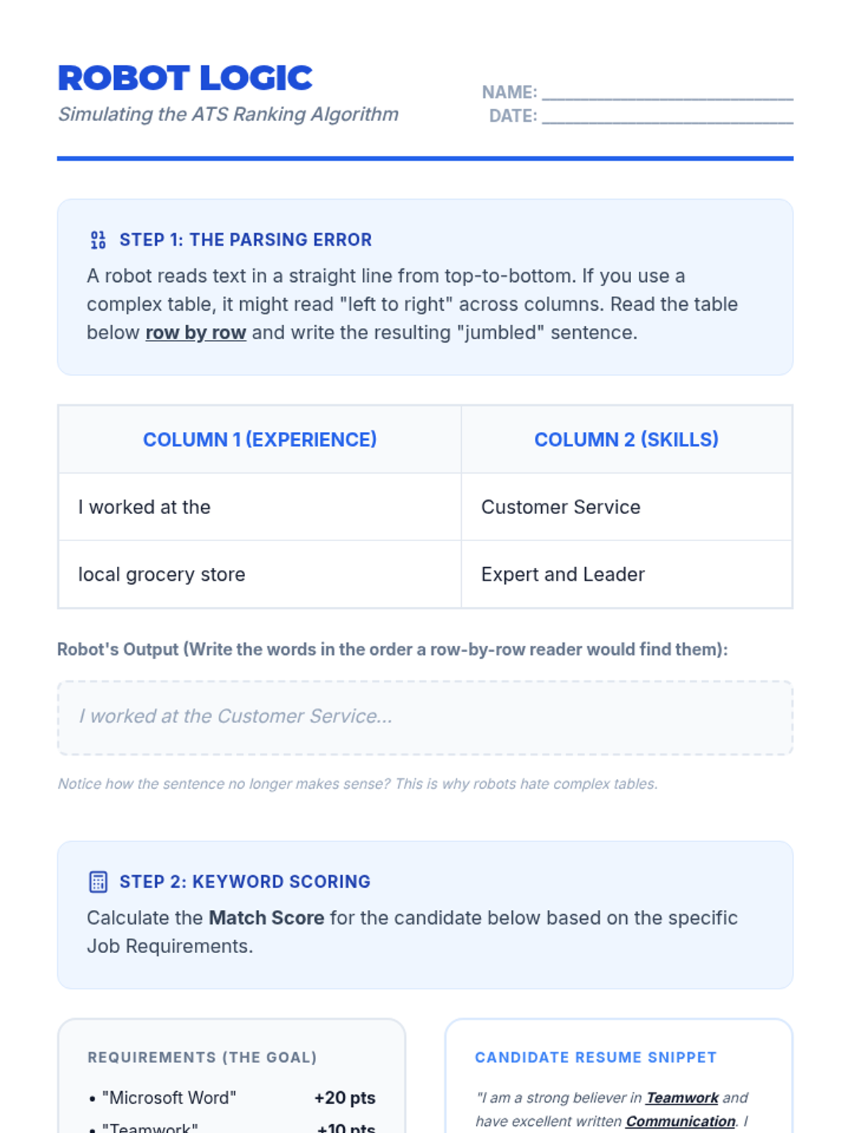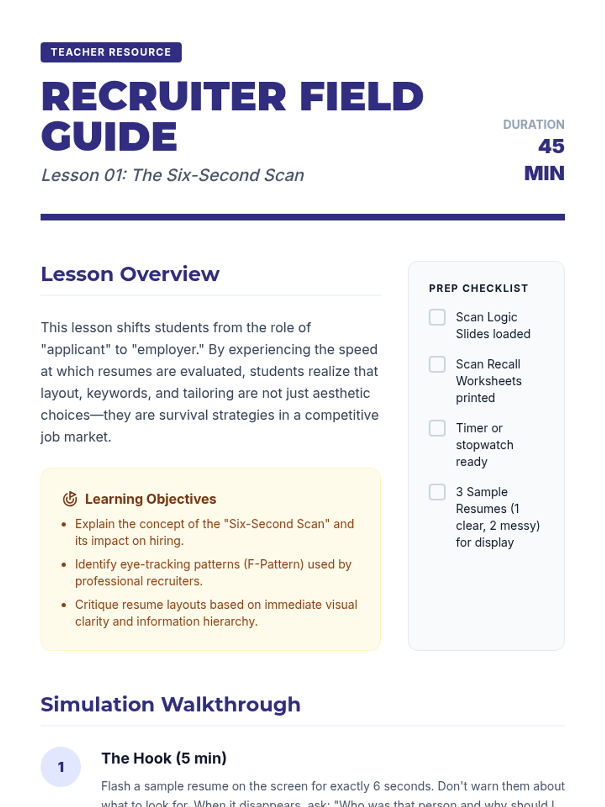 A comprehensive sequence for 9th-grade students to master the technical nuances of Applicant Tracking Systems (ATS). Students learn to format resumes for machine readability and strategically integrate keywords to ensure their human experiences are seen by human recruiters.